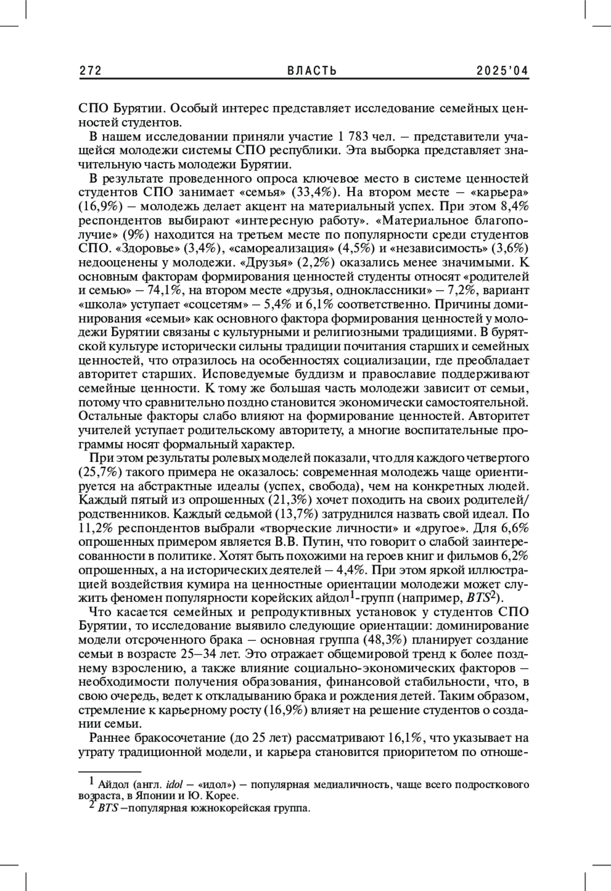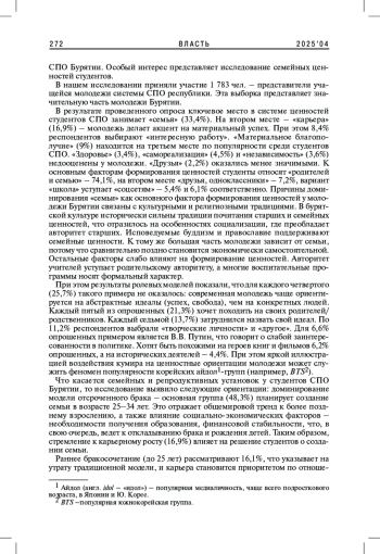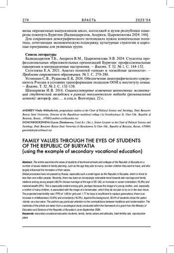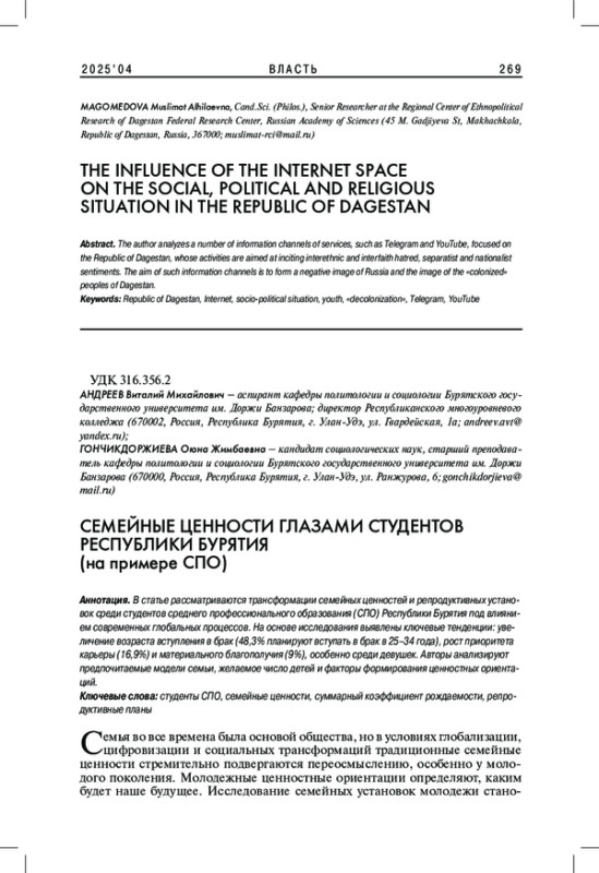 В статье рассматриваются трансформации семейных ценностей и репродуктивных установок среди студентов среднего профессионального образования (СПО) Республики Бурятия под влиянием современных глобальных процессов. На основе исследования выявлены ключевые тенденции: увеличение возраста вступления в брак (48,3% планируют вступать в брак в 25-34 года), рост приоритета карьеры (16,9%) и материального благополучия (9%), особенно среди девушек. Авторы анализируют предпочитаемые модели семьи, желаемое число детей и факторы формирования ценностных ориентаций.