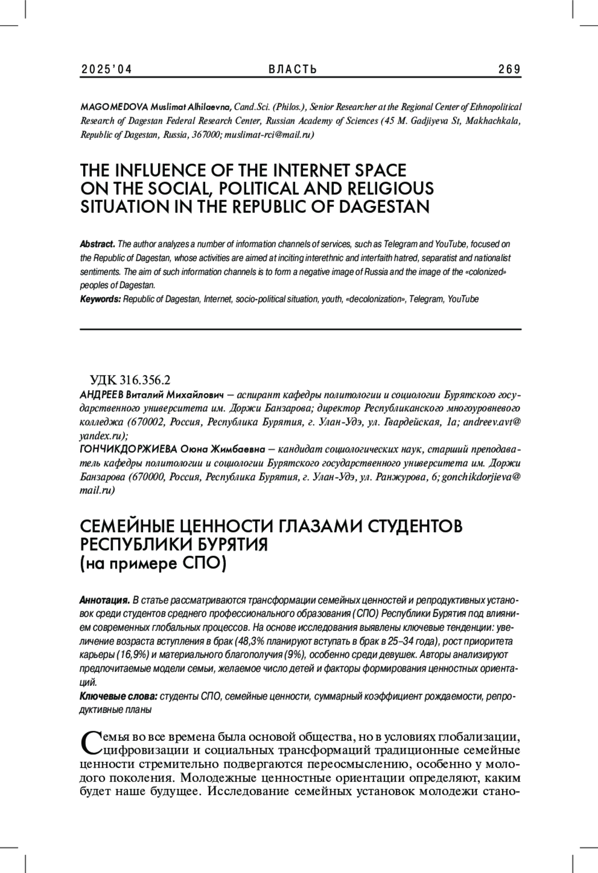 В статье автор анализирует ряд информационных каналов таких сервисов, как Telegram и YouTube, ориентированных на Республику Дагестан, деятельность которых направлена на разжигание межнациональной и межконфессиональной розни, сепаратистских и националистических настроений. Целью таких информационных каналов является формирование негативного образа России и образа колонизированных народов Дагестана.
