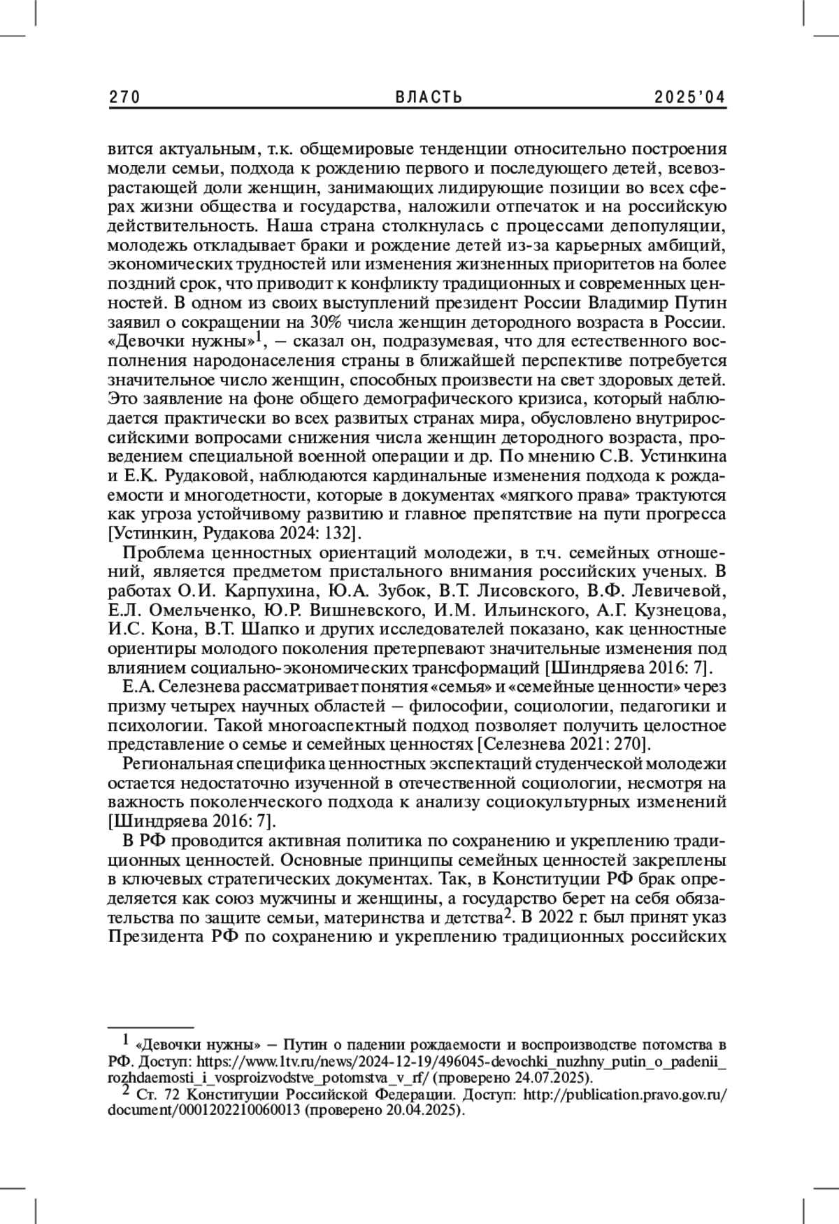 3. Устинкин С.В., Рудакова Е.К. 2024. Обеспечение демографического суверенитета России в условиях трансформации подходов ООН к институту семьи. - Власть. Т. 32. № 2. С. 132-138. EDN: TTHWYG