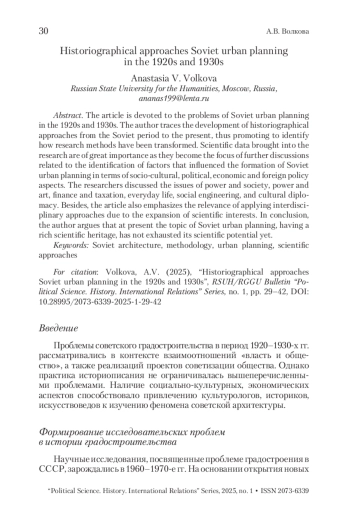 Статья посвящена проблемам изучения истории советского градостроения 1920-х и 1930-х гг. Автор прослеживает развитие историографических подходов от советского периода до современности, что способствует выявлению трансформации методов в решениях исследовательских задач. Научные работы, которые привлекались исследователем, являются ключевыми, так как вокруг них разворачиваются дальнейшие дискуссии, связанные с выявлением факторов, влиявших на формирование советского градостроения с точки зрения социально-культурных, политических, экономических и внешнеполитических аспектов. В работах исследователей поднимались проблемы: взаимодействия власти и общества, финансирования и налогообложения, повседневности и социального инжиниринга, и культурной дипломатии. Также в статье подчеркивается актуальность применения междисциплинарных подходов в связи с расширением границ научных интересов. В заключении статьи делается вывод о том, что в настоящее время тема советского градостроения, имея богатое научное наследие, не исчерпала свой научный потенциал.