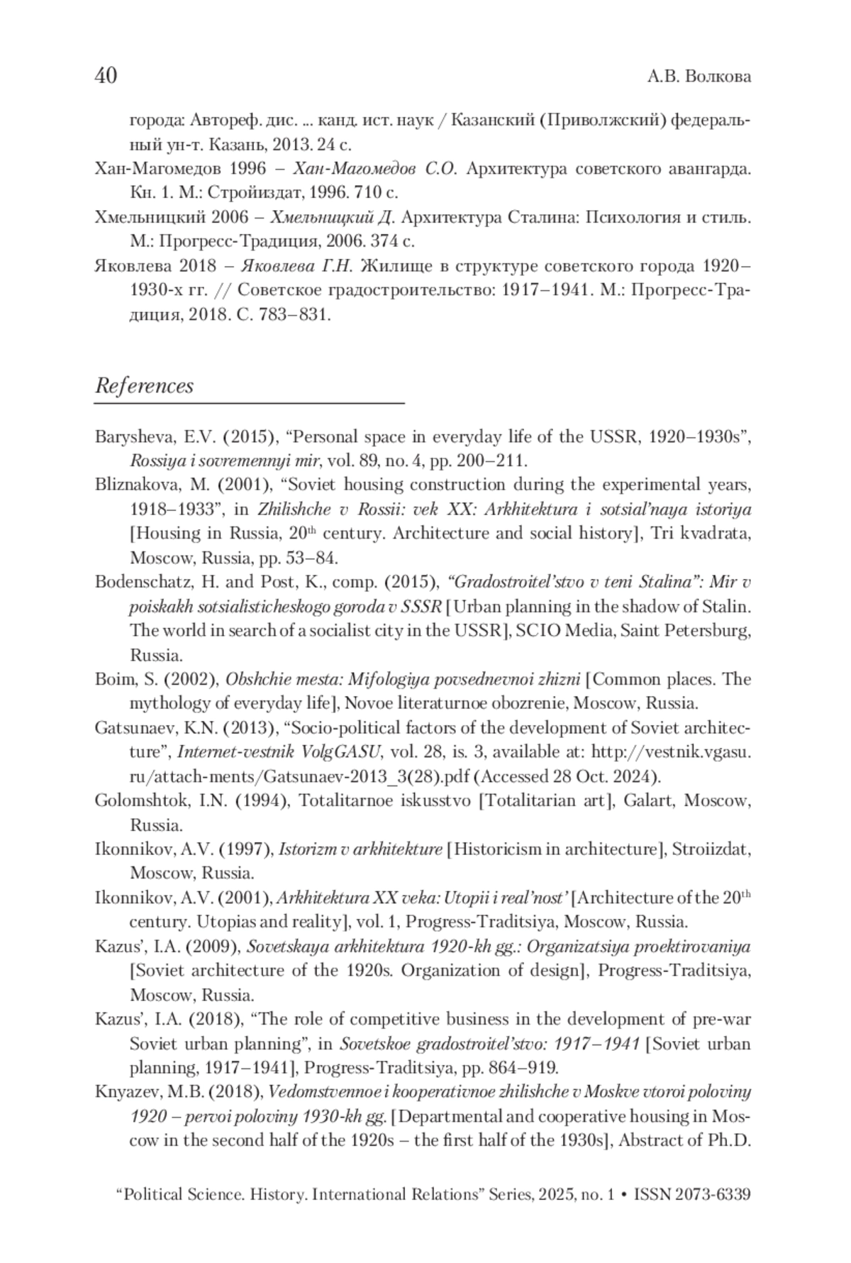5. Гацунаев 2013 - Гацунаев К.Н. Социально-политические факторы развития советской архитектуры (1931-1954 гг.) // Интернет-вестник ВолгГАСУ. Сер.: Политематическая. 2013. Вып. 3 (28). URL: http://vestnik.vgasu.ru/attach-ments/Gatsunaev-2013_3(28).pdf (дата обращения 28 октября 2024).