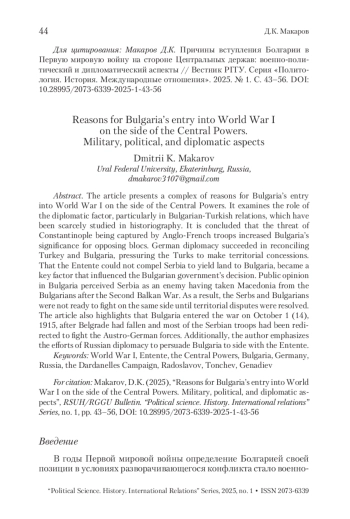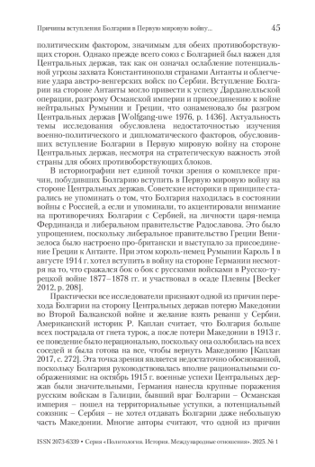 В статье рассмотрен комплекс причин вступления Болгарии в Первую мировую войну на стороне Центральных держав. Было уделено внимание роли дипломатического фактора в особенности болгаро-турецких отношений, которые почти не исследованы в историографии. Автор пришел к выводу, что угроза захвата Константинополя англо-французскими войсками усилила значимость Болгарии для противоборствующих блоков. Немецкая дипломатия смогла примирить Турцию и Болгарию и вынудила турок пойти на территориальные уступки. В то время как страны Антанты не смогли принудить Сербию к территориальным уступкам в пользу Болгарии, что стало ключевым фактором, который повлиял на решение болгарского правительства. Общественное мнение в Болгарии воспринимало Сербию как врага, отнявшего у болгар Македонию после Второй Балканской войны, и поэтому сербы и болгары были не готовы сражаться на одной стороне до урегулирования территориальных споров. Автор обратил внимание на то, что Болгария вступила в войну 1 (14) октября 1915 г., после того как пал Белград и большая часть сербских войск была переброшена на борьбу с австро-германскими войсками. Также автор уделил большое внимание усилиям русской дипломатии по привлечению Болгарии на сторону Антанты.