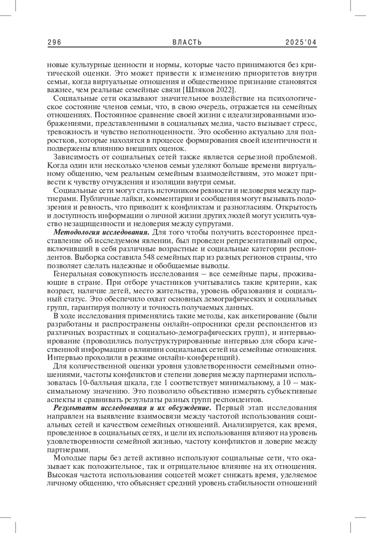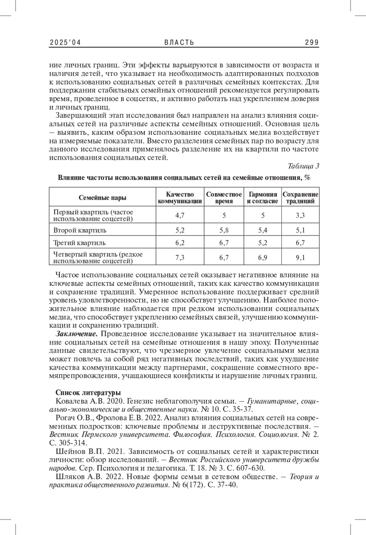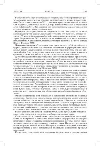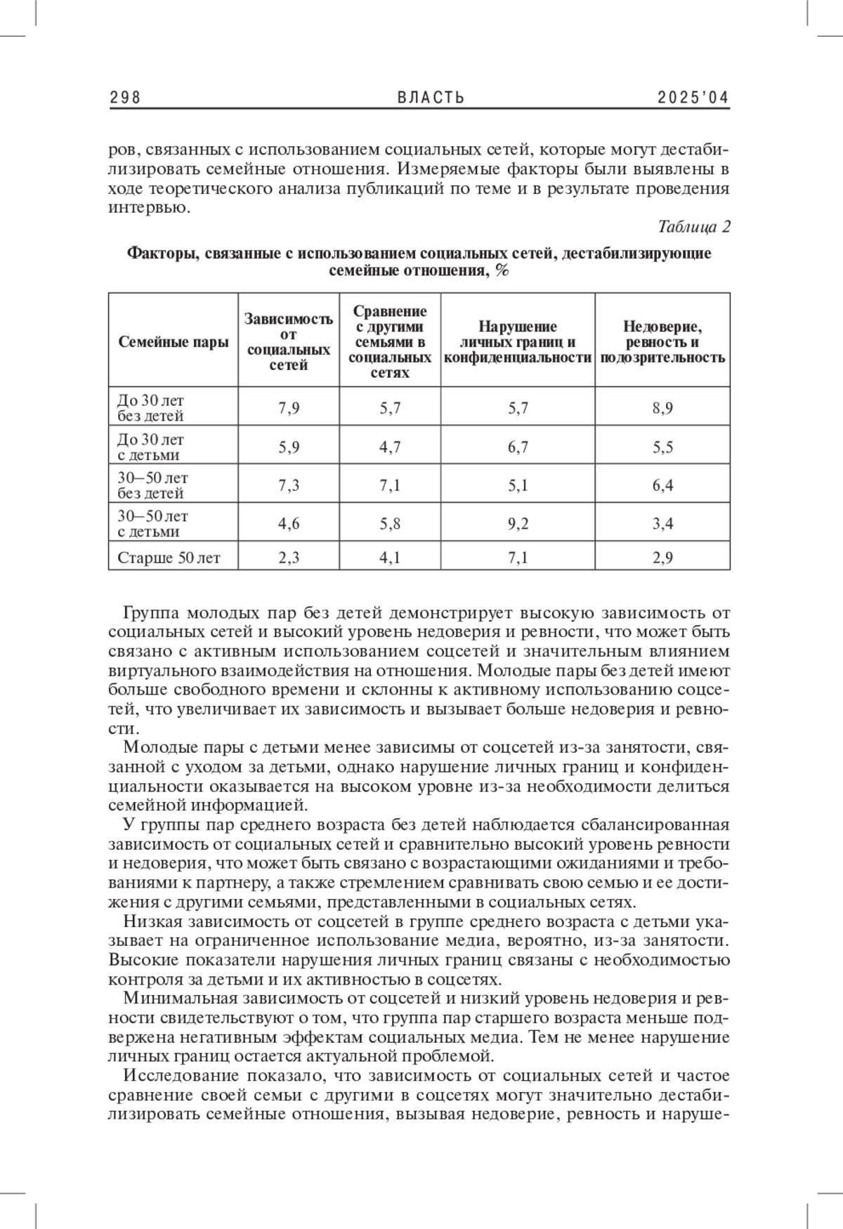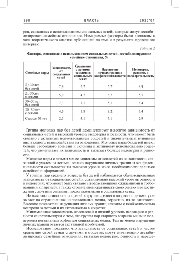 В статье изучается влияние на семейную жизнь характерного для современного общества повсеместного использования цифровых технологий и, в первую очередь, социальных медиа. Исследуются факторы, связанные с частотой и целями использования социальных сетей, и их воздействие на ключевые характеристики семейной жизни. В частности, рассматривается, как активность в социальных медиа сказывается на уровне удовлетворенности семейной жизнью, частоте возникновения конфликтов, качестве коммуникации между партнерами и степени доверия между ними. Респондентами выступили представители различных возрастных групп, а также семьи с разным количеством детей. Такой подход позволил выявить ключевые закономерности и сформулировать практические рекомендации для укрепления семейных связей в условиях растущей цифровизации общества. Основной вывод исследования заключается в необходимости нахождения баланса между виртуальной и реальной жизнью для поддержания гармоничных отношений внутри семьи. В то же время разумное и целенаправленное использование социальных медиа может способствовать укреплению семьи, если оно не подменяет собой живое общение.