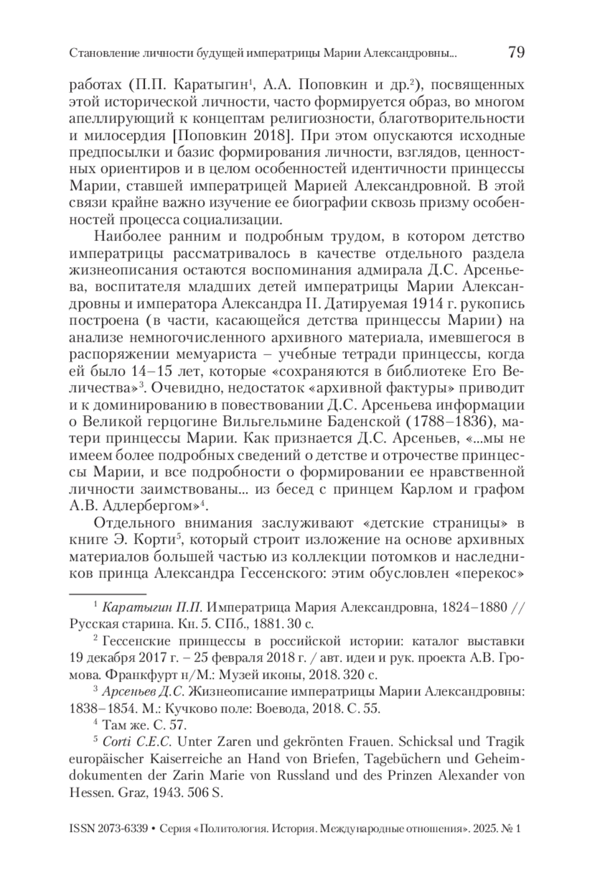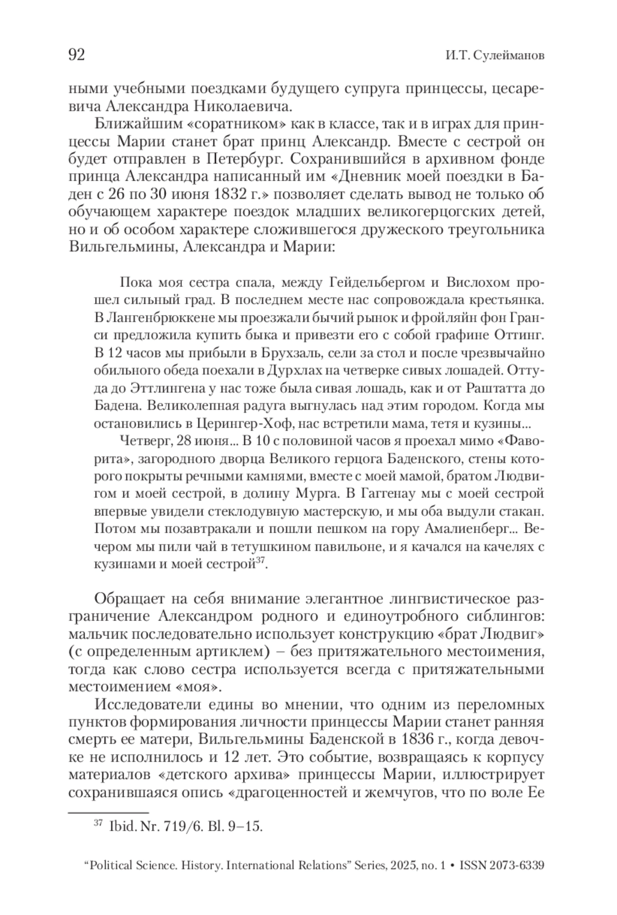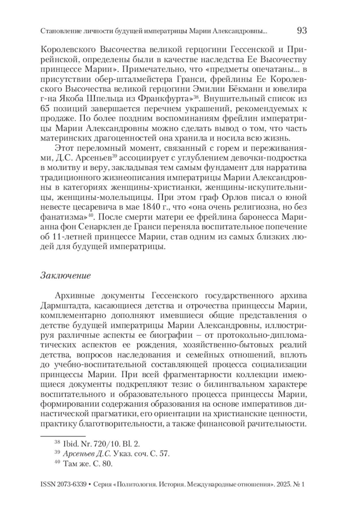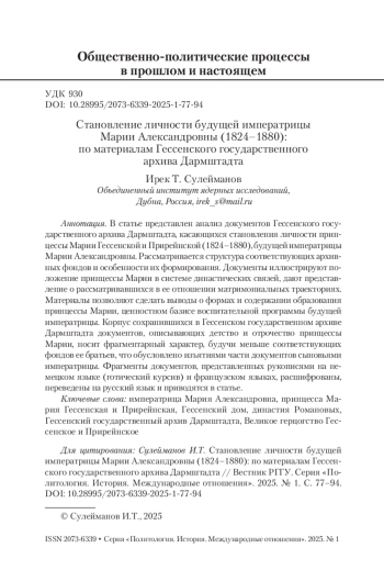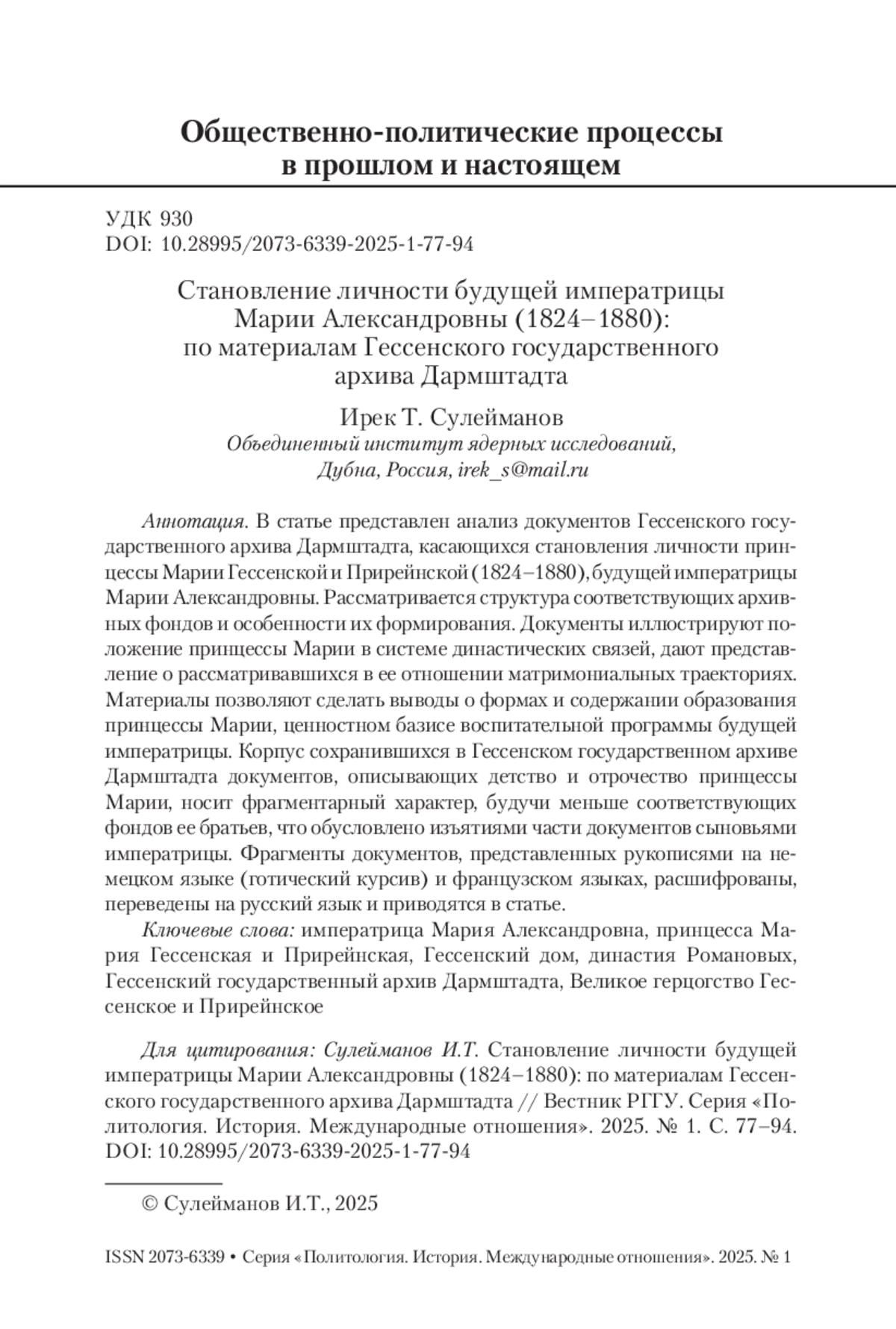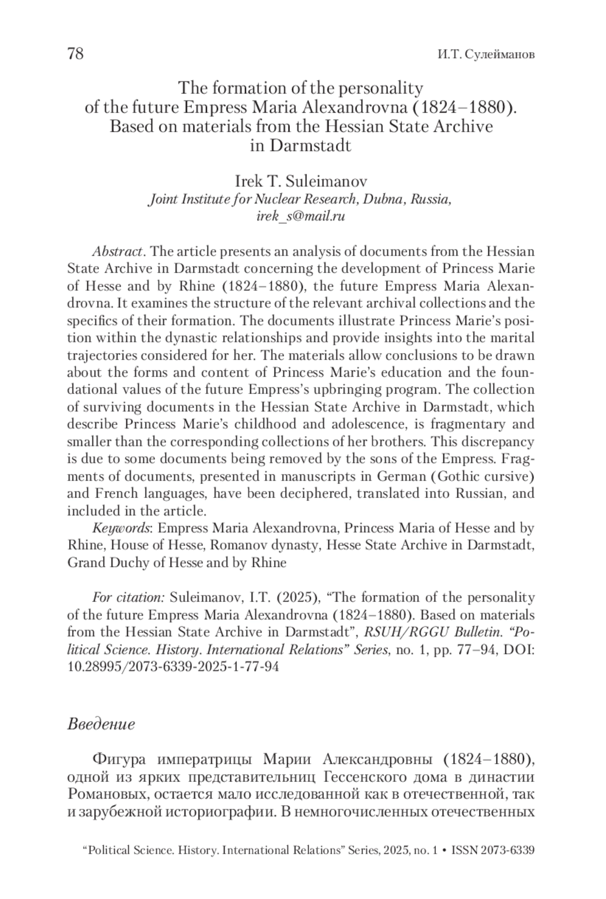 В статье представлен анализ документов Гессенского государственного архива Дармштадта, касающихся становления личности принцессы Марии Гессенской и Прирейнской (1824–1880), будущей императрицы Марии Александровны. Рассматривается структура соответствующих архивных фондов и особенности их формирования. Документы иллюстрируют положение принцессы Марии в системе династических связей, дают представление о рассматривавшихся в ее отношении матримониальных траекториях. Материалы позволяют сделать выводы о формах и содержании образования принцессы Марии, ценностном базисе воспитательной программы будущей императрицы. Корпус сохранившихся в Гессенском государственном архиве Дармштадта документов, описывающих детство и отрочество принцессы Марии, носит фрагментарный характер, будучи меньше соответствующих фондов ее братьев, что обусловлено изъятиями части документов сыновьями императрицы. Фрагменты документов, представленных рукописями на немецком языке (готический курсив) и французском языках, расшифрованы, переведены на русский язык и приводятся в статье.