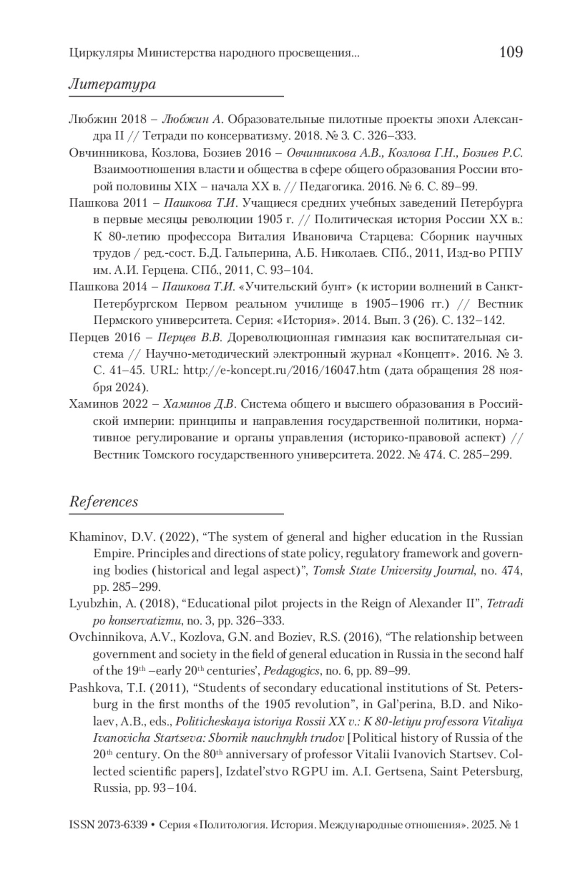 6. Хаминов 2022 - Хаминов Д.В. Система общего и высшего образования в Российской империи: принципы и направления государственной политики, нормативное регулирование и органы управления (историко-правовой аспект) // Вестник Томского государственного университета. 2022. № 474. С. 285-299.