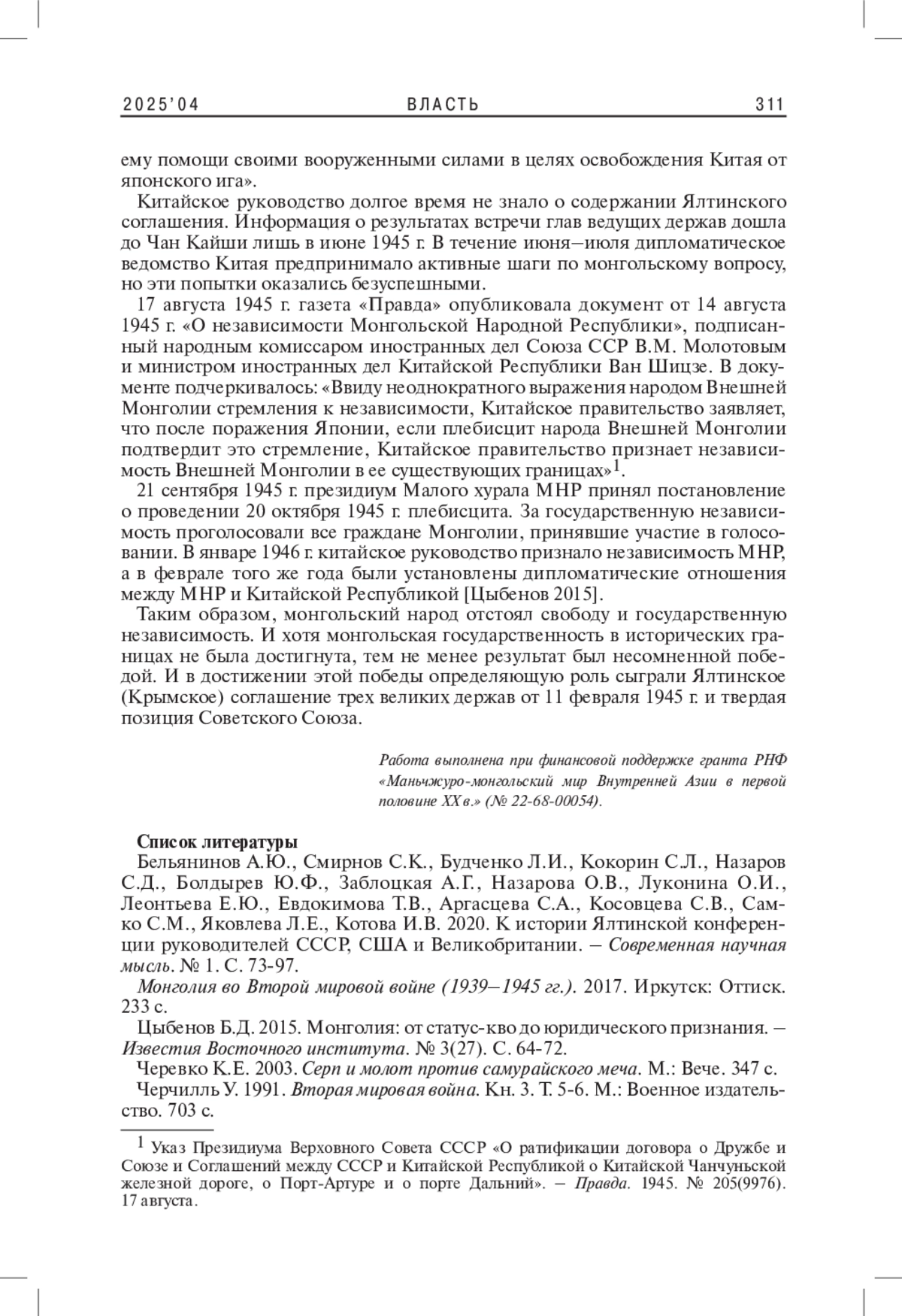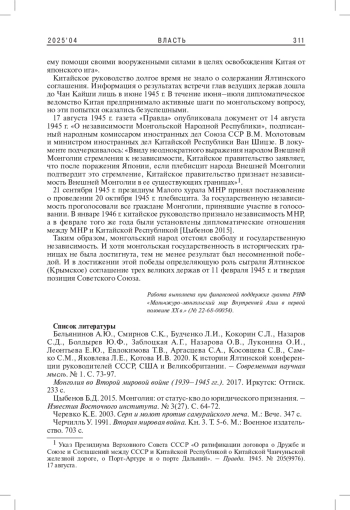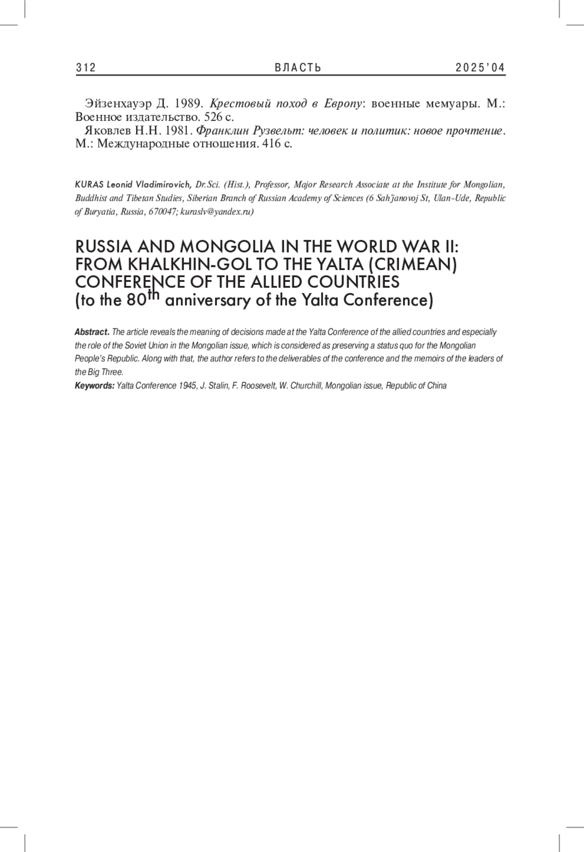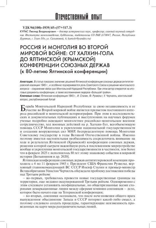 В статье показано значение решений Ялтинской конференции союзных держав антигитлеровской коалиции 1945 г. и особенно подчеркивается роль Советского Союза в решении монгольского вопроса - сохранении status quo Монгольской Народной Республики. При этом автор опирается на итоговые документы конференции, а также воспоминания лидеров «Большой тройки».