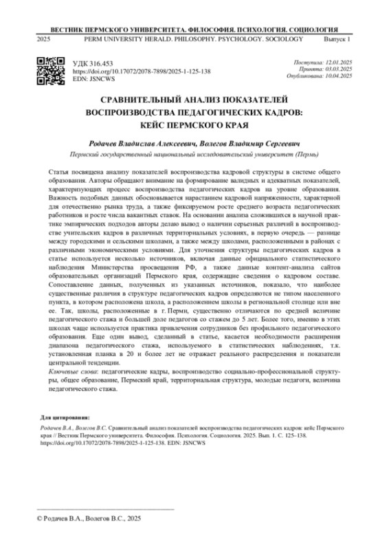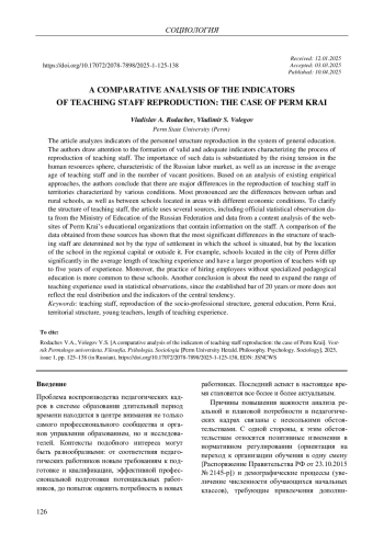 Статья посвящена анализу показателей воспроизводства кадровой структуры в системе общего образования. Авторы обращают внимание на формирование валидных и адекватных показателей, характеризующих процесс воспроизводства педагогических кадров на уровне образования. Важность подобных данных обосновывается нарастанием кадровой напряженности, характерной для отечественно рынка труда, а также фиксируемом росте среднего возраста педагогических работников и росте числа вакантных ставок. На основании анализа сложившихся в научной практике эмпирических подходов авторы делаю вывод о наличии серьезных различий в воспроизводстве учительских кадров в различных территориальных условиях, в первую очередь - разнице между городскими и сельскими школами, а также между школами, расположенными в районах с различными экономическими условиями. Для уточнения структуры педагогических кадров в статье используется несколько источников, включая данные официального статистического наблюдения Министерства просвещения РФ, а также данные контент-анализа сайтов образовательных организаций Пермского края, содержащие сведения о кадровом составе. Сопоставление данных, полученных из указанных источников, показало, что наиболее существенные различия в структуре педагогических кадров определяются не типом населенного пункта, в котором расположена школа, а расположением школы в региональной столице или вне ее. Так, школы, расположенные в г. Перми, существенно отличаются по средней величине педагогического стажа и большей доле педагогов со стажем до 5 лет. Более того, именно в этих школах чаще используется практика привлечения сотрудников без профильного педагогического образования. Еще один вывод, сделанный в статье, касается необходимости расширения диапазона педагогического стажа, используемого в статистических наблюдениях, т. к. установленная планка в 20 и более лет не отражает реального распределения и показатели центральной тенденции.