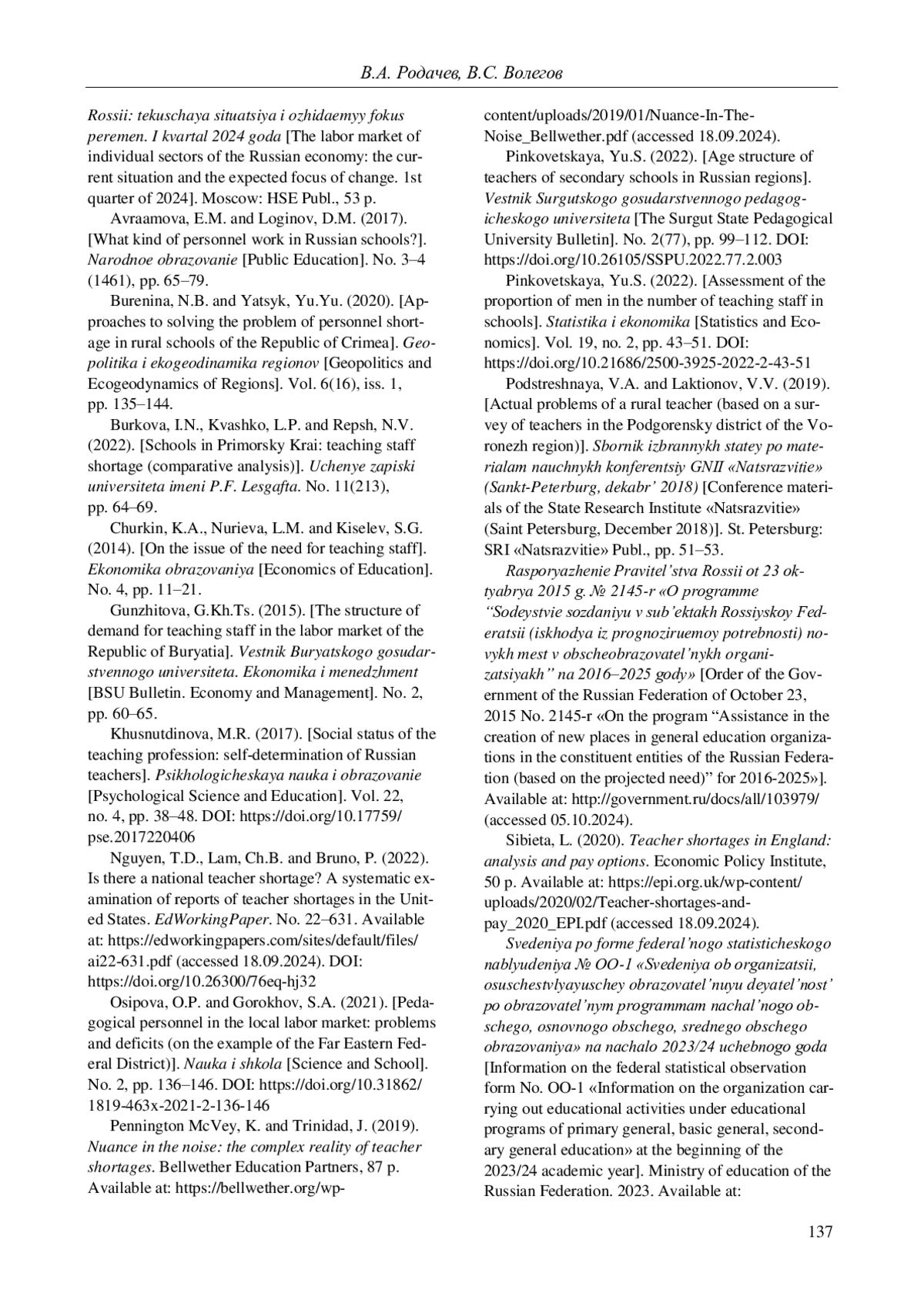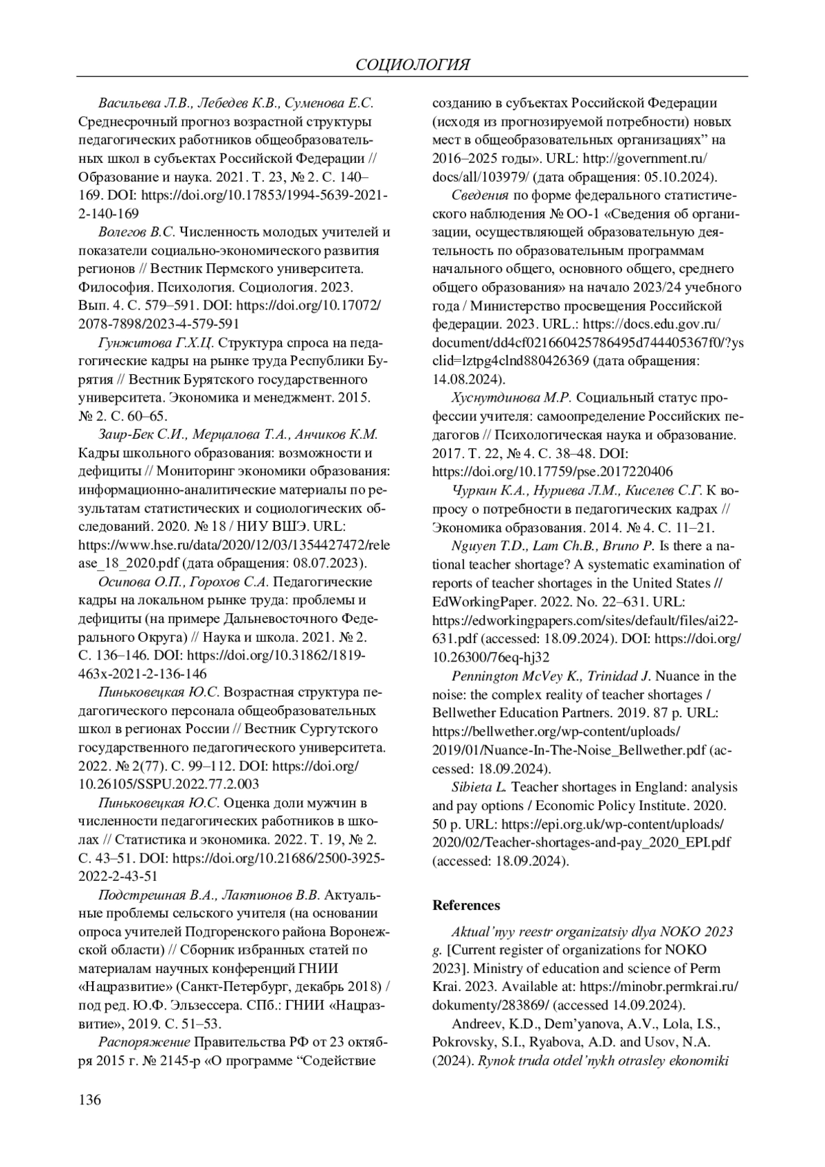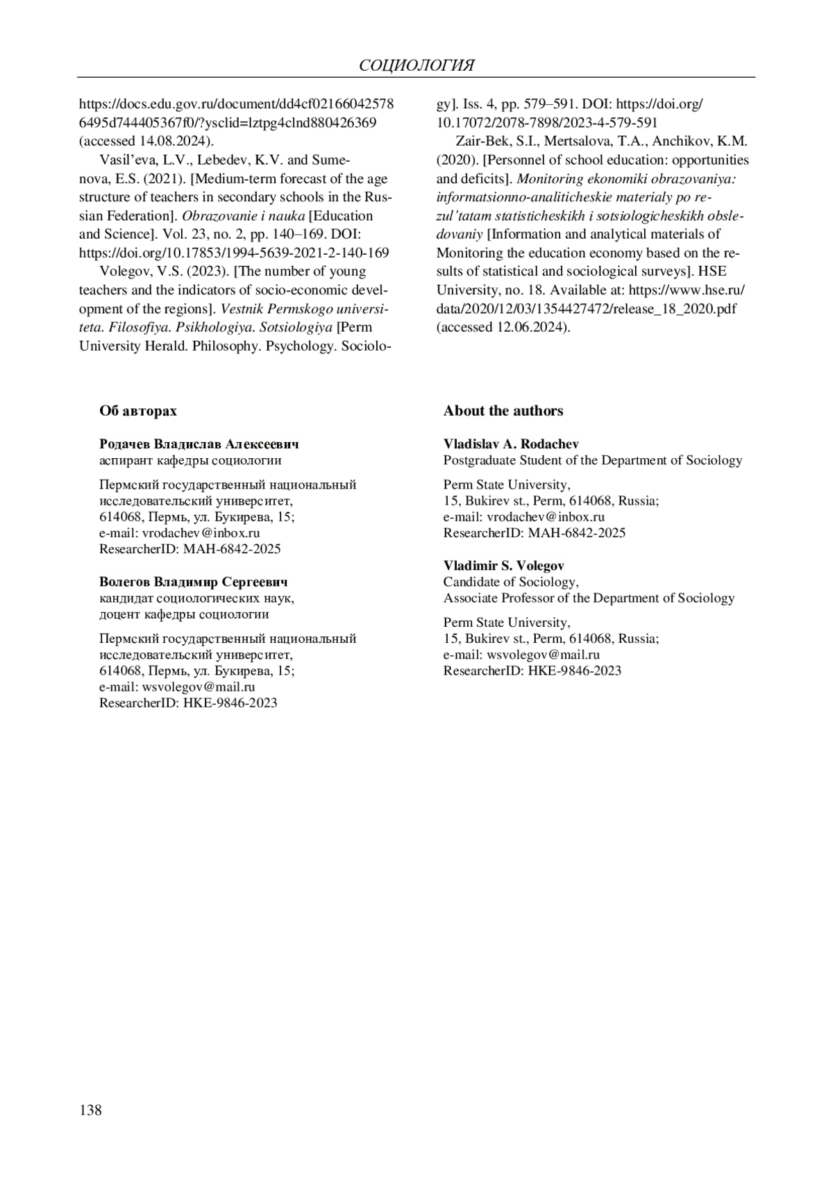 7. 	Волегов В.С. Численность молодых учителей и показатели социально-экономического развития регионов // Вестник Пермского университета. Философия. Психология. Социология. 2023. Вып. 4. С. 579-591. DOI: 10.17072/2078-7898/2023-4-579-591 EDN: HRDZPF