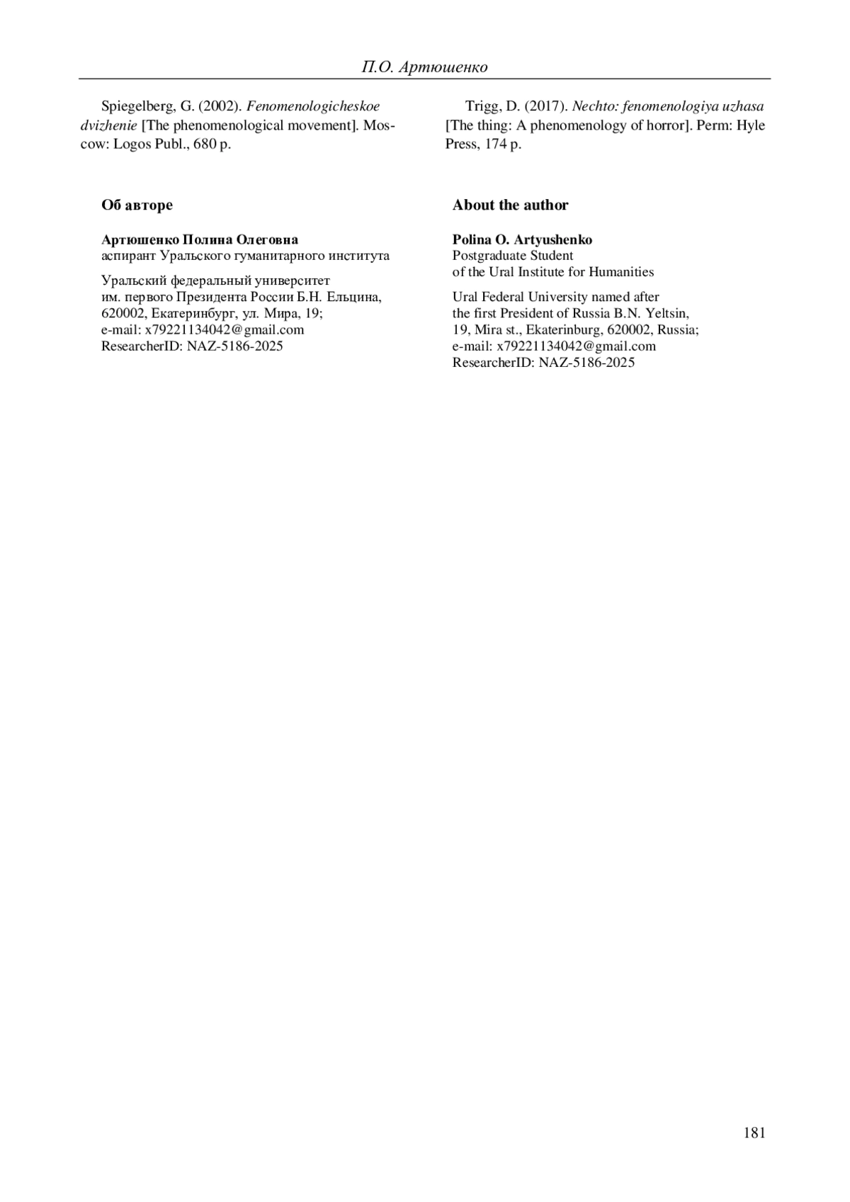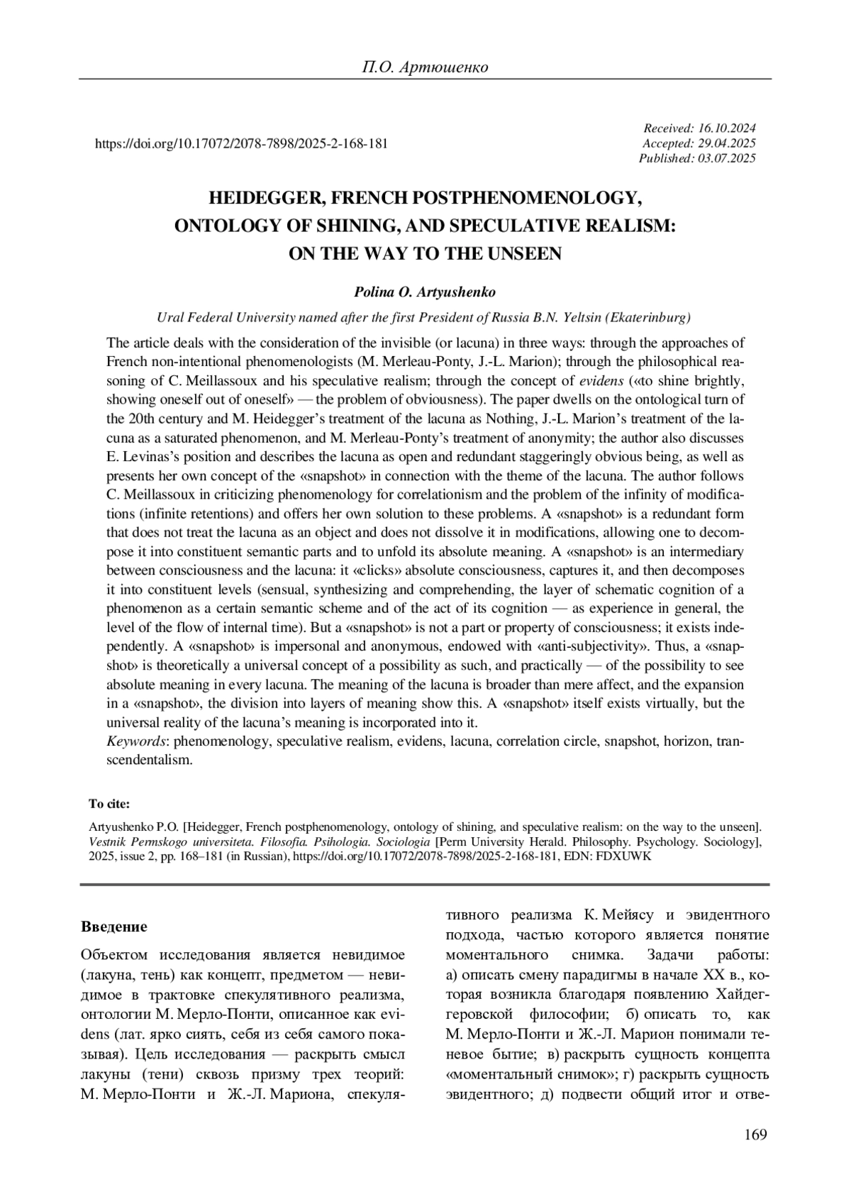 АРТЮШЕНКО П. О. ХАЙДЕГГЕР, ФРАНЦУЗСКАЯ ПОСТФЕНОМЕНОЛОГИЯ, ОНТОЛОГИЯ СИЯНИЯ И СПЕКУЛЯТИВНЫЙ РЕАЛИЗМ: НА ПУТИ К НЕВИДИМОМУ // ВЕСТНИК ПЕРМСКОГО УНИВЕРСИТЕТА. ФИЛОСОФИЯ. ПСИХОЛОГИЯ. СОЦИОЛОГИЯ. 2025. № 2