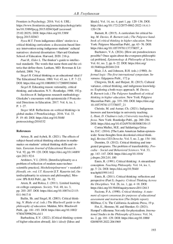 21. 	Bailin Sh., Siegel H. Critical thinking // The Blackwell guide to the philosophy of education / ed. by N. Blake et al. Malden, MA: Blackwell, 2003. P. 181-193. DOI: 10.1002/9780470996294.ch11