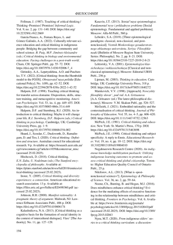 36. 	Hitchcock D. Critical Thinking // The Stanford encyclopedia of philosophy / ed. by E.N. Zalta, U. Nodelman. 2018. URL: https://plato.stanford.edu/archives/fall2018/entries/critical-thinking (accessed: 25.02.2025).