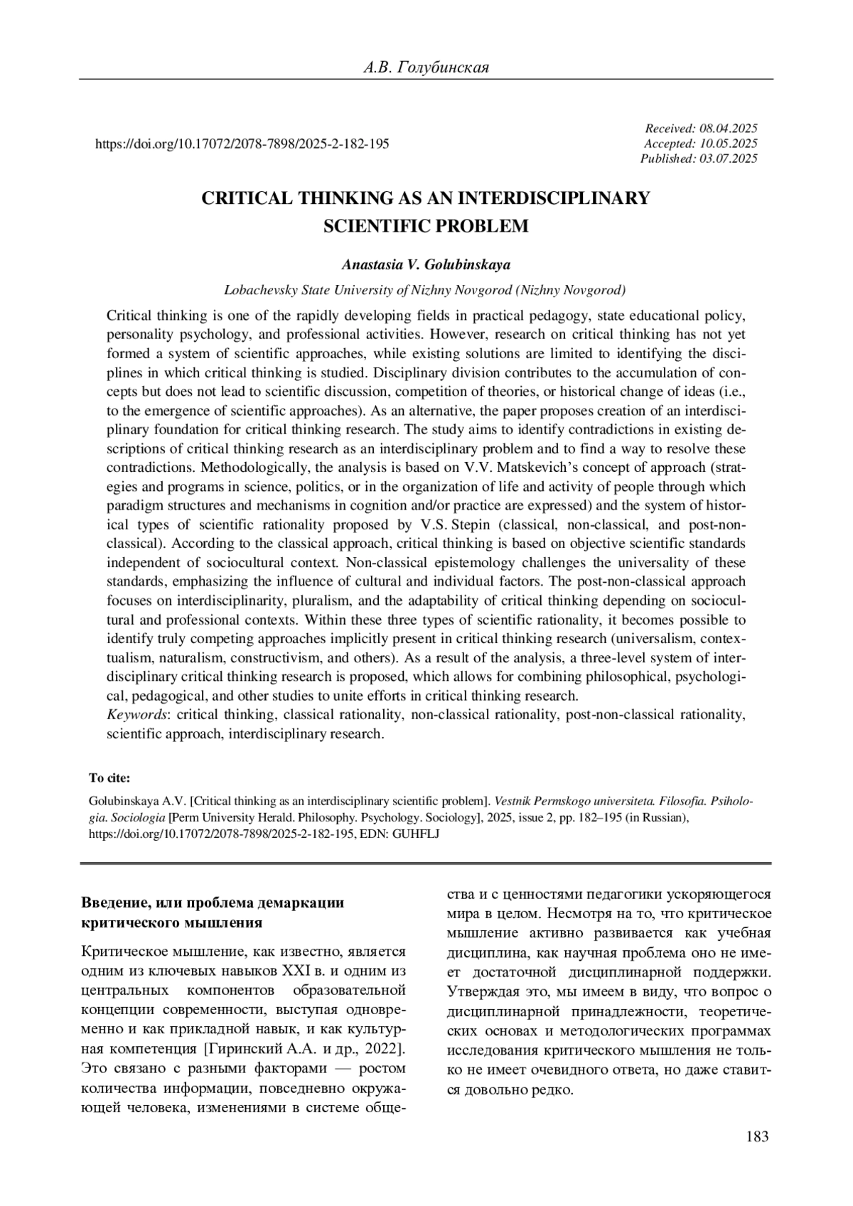 Критическое мышление - одна из активно развивающихся областей практической педагогики, государственной образовательной политики, психологии личности и профессиональной деятельности. Однако исследования критического мышления не образовали систему научных подходов, а существующие решения ограничиваются указанием дисциплин, в рамках которых изучается критическое мышление. Отмечено, что дисциплинарное разделение способствует накоплению концепций, однако не приводит к установлению научной дискуссии, конкуренции теорий, исторической сменяемости идей (то есть - к появлению именно научных подходов). В качестве альтернативы предлагается создание междисциплинарной основы для исследований критического мышления. Цель работы заключается в выявлении противоречий в существующих описаниях исследований критического мышления как междисциплинарной проблемы и поиске варианта их разрешения. В качестве методологии анализа используется понятие подхода В. В. Мацкевича (стратегии и программы в науке, политике или организации жизни и деятельности людей, через которые выражаются парадигматические структуры и механизмы в познании и/или практике) и система исторических типов научной рациональности В. С. Степина (классическая, неклассическая и постнеклассическая). Согласно классическому подходу критическое мышление основывается на объективных, научных стандартах, не зависящих от социокультурного контекста. Неклассическая эпистемология оспаривает универсальность этих стандартов, подчеркивая влияние культурных и индивидуальных факторов. Постнеклассический подход акцентирует внимание на междисциплинарности, плюрализме и адаптивности критического мышления в зависимости от социокультурных и профессиональных контекстов. В рамках этих трех типов научной рациональности становится возможным указать на действительно конкурирующие подходы, неявно присутствующие в исследованиях критического мышления (универсализм, контекстуализм, натурализм, конструктивизм и др.). В результате анализа предложена трехуровневая система междисциплинарных исследований критического мышления, которая позволяет комбинировать философские, психологические, педагогические и другие исследования с целью объединения усилий в рамках исследования критического мышления.
