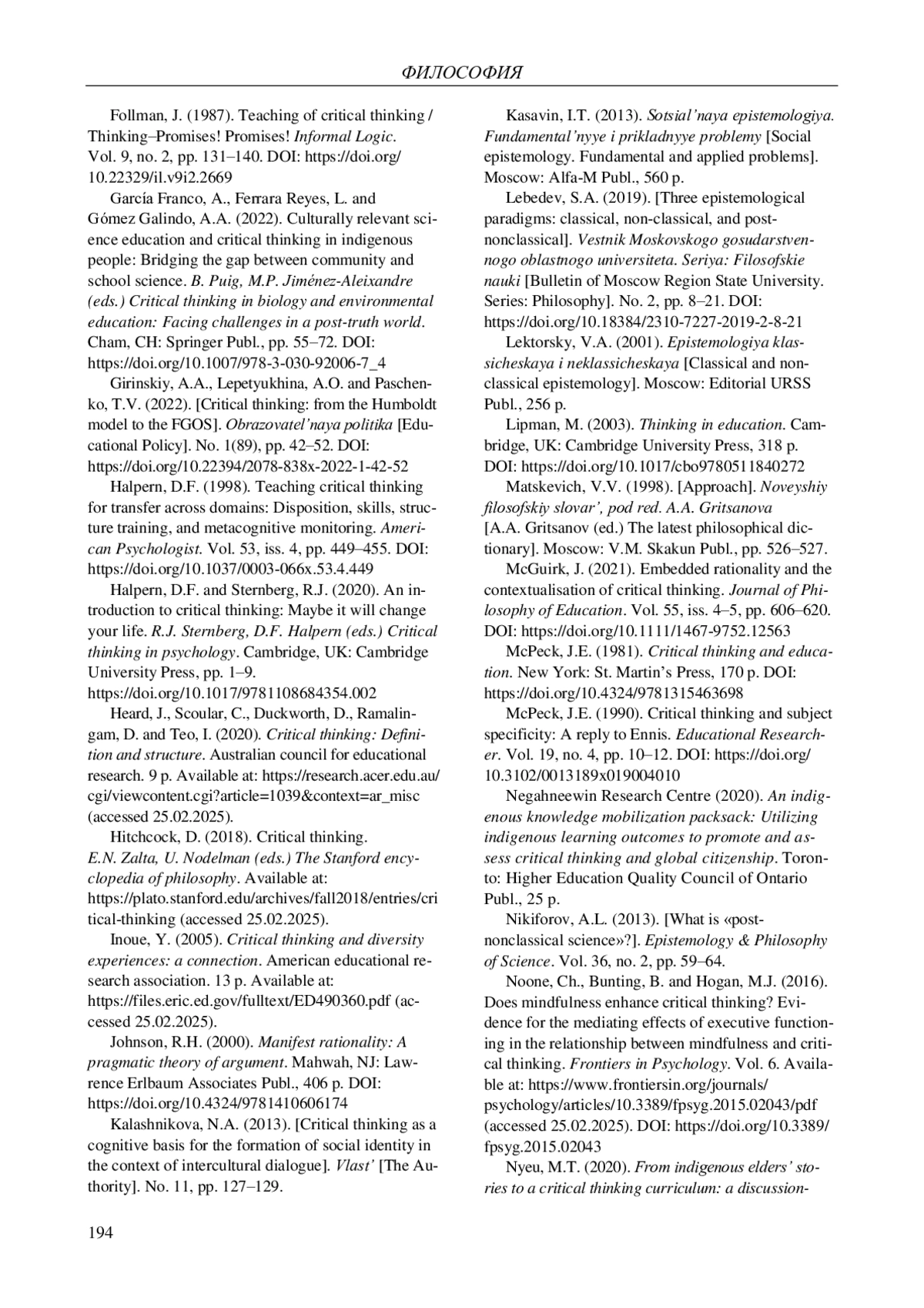 4. 	Гиринский А.А., Лепетюхина А.О., Пащенко Т.В. Критическое мышление: от гумбольдтовской модели до ФГОС // Образовательная политика. 2022. № 1(89). С. 42-52. DOI: 10.22394/2078-838x-2022-1-42-52 EDN: BROWTR