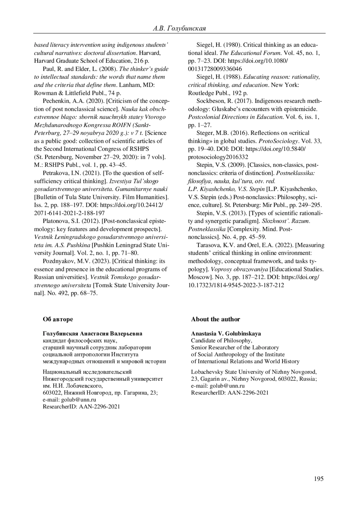 41. 	McGuirk J. Embedded rationality and the contextualisation of critical thinking // Journal of Philosophy of Education. 2021. Vol. 55, iss. 4-5. P. 606-620. DOI: 10.1111/1467-9752.12563 EDN: NGGMWQ