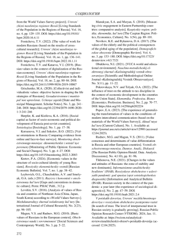 21. 	Тихонова Н.Е. Изменения в ценностях и установках россиян: зона устойчивости и новые доминанты // Информационно-аналитический бюллетень (ИНАБ). Российское общество в условиях пандемии: год спустя (опыт социологической диагностики). 2021. № 2. С. 47-59. DOI: 10.19181/inab.2021.2.4