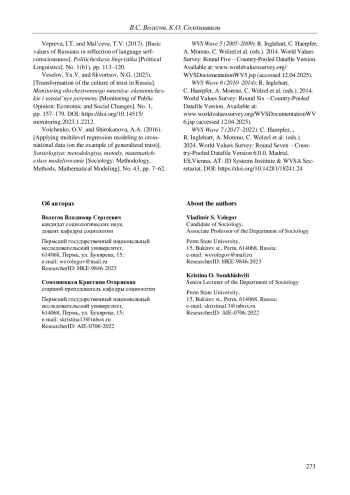 10. 	Корсунова В.И., Соколов Б.О. Ценностные установки россиян: сравнение результатов онлайн- и офлайн-опросов // Мониторинг общественного мнения: экономические и социальные перемены. 2022. № 3. С. 4-27. DOI: 10.14515/monitoring.2022.3.2083 EDN: YNYQOP