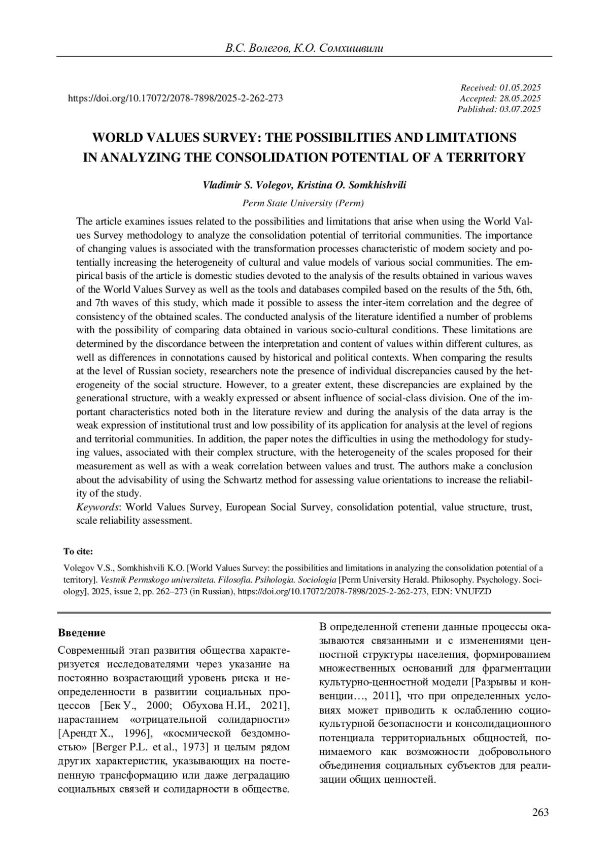 В статье рассматриваются вопросы, связанные с возможностями и ограничениями, возникающими при использовании методики Всемирного обзора ценностей для анализа консолидационного потенциала территориальных общностей. Важность изменения ценностей связана с трансформационными процессами, характерными для современного общества и потенциально усиливающими разнородность культурно-ценностных моделей различных социальных общностей. Эмпирической базой статьи являются отечественные исследования, посвященные анализу результатов различных волн Всемирного обзора ценностей, а также инструментарий и базы данных по итогам проведения 5-ой, 6-ой и 7-ой волн данного исследования, позволившие оценить межпунктовую корреляцию и степень согласованности получаемых шкал. Проведенный анализ литературы позволил выделить ряд проблем с возможностью сопоставления данных, полученных в различных социокультурных условиях. Данные ограничения связанны с несовпадением интерпретации и содержательного наполнения ценностей в рамках различных культур, а также расхождениями в коннотациях, вызванными историческим и политическим контекстами. При сравнении результатов на уровне российского общества исследователями фиксируется наличие отдельных расхождений, вызванных неоднородностью социальной структуры. Однако в большей степени данные расхождения связаны с поколенческой структурой, при слабой выраженности или отсутствии влияния социально-классового деления. Одной из важных характеристик, зафиксированных как в обзоре литературы, так и в ходе анализа массива данных, является слабая выраженность институционального доверия и возможности его применения для анализа на уровне регионов и территориальных сообществ. Кроме того, в работе отмечаются сложности в применении методики изучения ценностей, связанные как с их сложной структурой и неоднородностью шкал, предлагаемых для их измерения, так и со слабой корреляцией между ценностями и доверием. На основании проведенного анализа делается вывод о целесообразности использования методики оценки ценностных ориентаций Шварца для повышения надежности исследования.