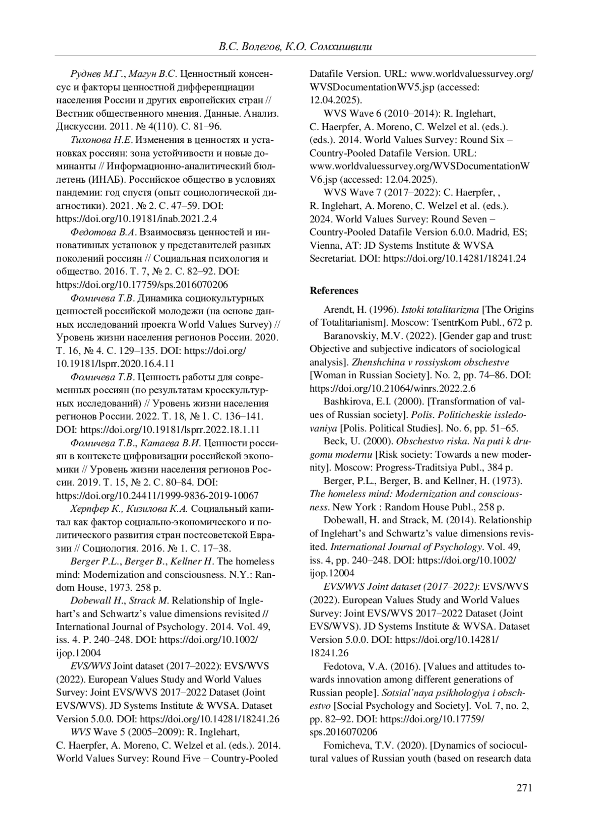 7. 	Веселов Ю.В., Скворцов Н.Г. Трансформация культуры доверия в России // Мониторинг общественного мнения: экономические и социальные перемены. 2023. № 1. С. 157-179. DOI: 10.14515/monitoring.2023.1.2212 EDN: BGVQNQ