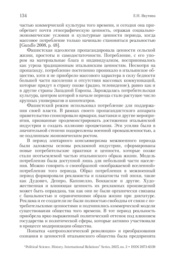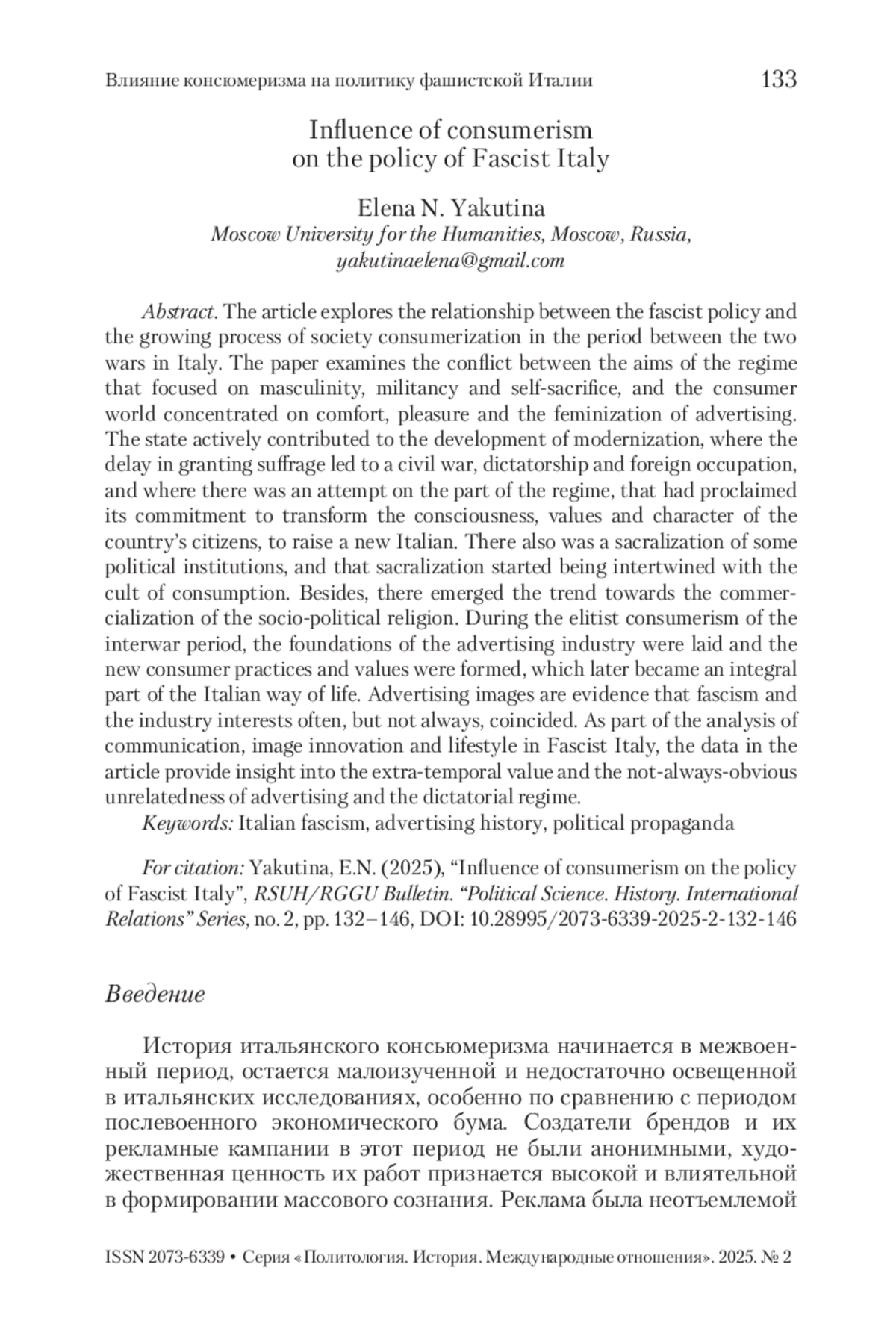 В статье исследуется соотношение между фашистcкой политикой и нарастающим процессом консьюмеризации общества в период между двумя войнами в Италии. Рассматривается конфликт целей режима с его акцентом на мужественности, воинственности и самопожертвовании и миром потребления, ориентированном на комфорт, удовольствие и феминизацию рекламы. Государство активно участвовало в модернизации, где задержка с предоставлением избирательного права привела к гражданской войне, диктатуре и иностранной оккупации, и где со стороны режима была предпринята попытка воспитания нового итальянца, провозгласившая свою приверженность преобразованию сознания, ценностей и характера жителей страны. Произошла сакрализация некоторых политических институтов, которая стала смыкаться с культом потребления, возникла тенденция к коммерциализации социально-политической религии. В период элитарного консьюмеризма межвоенного периода были заложены основы рекламной индустрии, сформированы новые потребительские практики и ценности, которые позже стали неотъемлемой частью итальянского образа жизни. Рекламные изображения являются свидетельством того, что фашизм и интересы промышленности не всегда, но часто совпадали. В рамках анализа коммуникации, образных инноваций и образа жизни в фашистской Италии данные в статье дают представление о вневременной ценности и не всегда очевидной несвязанности рекламы с диктатурой режима.