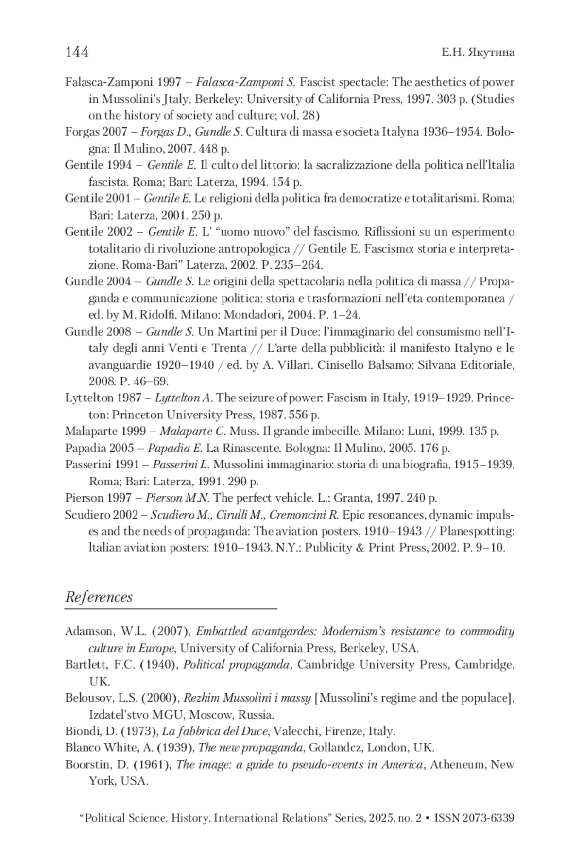 18. Gundle 2008 - Gundle S. Un Martini per il Duce: l’immaginario del consumismo nell’Italy degli anni Venti e Trenta // L’arte della pubblicità: il manifesto Italyno e le avanguardie 1920-1940 / ed. by A. Villari. Cinisello Balsamo: Silvana Editoriale, 2008. P. 46-69.