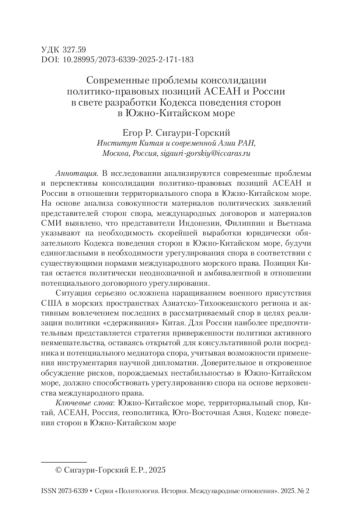 В исследовании анализируются современные проблемы и перспективы консолидации политико-правовых позиций АСЕАН и России в отношении территориального спора в Южно-Китайском море. На основе анализа совокупности материалов политических заявлений представителей сторон спора, международных договоров и материалов СМИ выявлено, что представители Индонезии, Филиппин и Вьетнама указывают на необходимость скорейшей выработки юридически обязательного Кодекса поведения сторон в Южно-Китайском море, будучи единогласными в необходимости урегулирования спора в соответствии с существующими нормами международного морского права. Позиция Китая остается политически неоднозначной и амбивалентной в отношении потенциального договорного урегулирования.