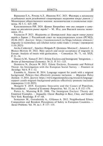 6. 	Danzer A.M., Yaman F. 2013. Ethnic Enclaves and Immigrants’ Integration. - Review of International Economics. № 21. P. 311-325.