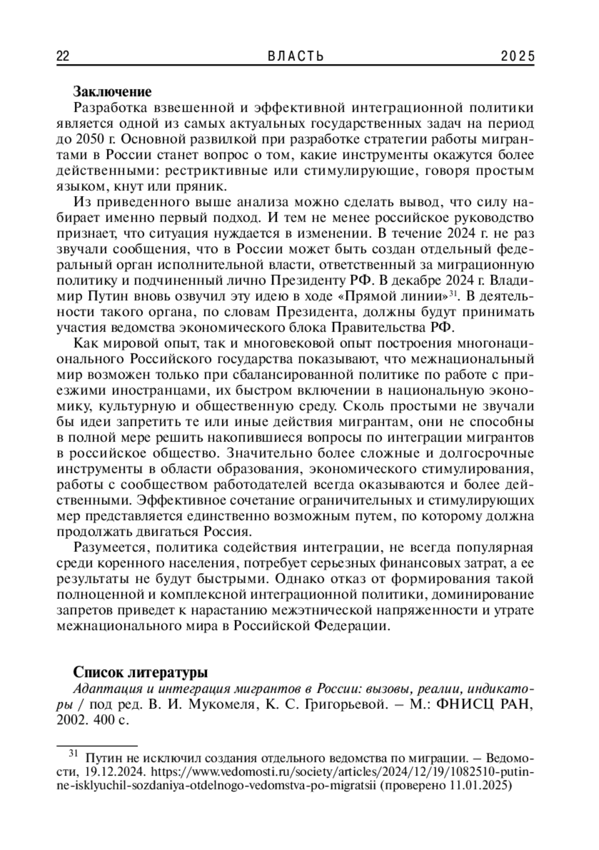 1. 	Адаптация и интеграция мигрантов в России: вызовы, реалии, индикаторы / под ред. В. И. Мукомеля, К. С. Григорьевой. - М.: ФНИСЦ РАН, 2002. 400 с.
