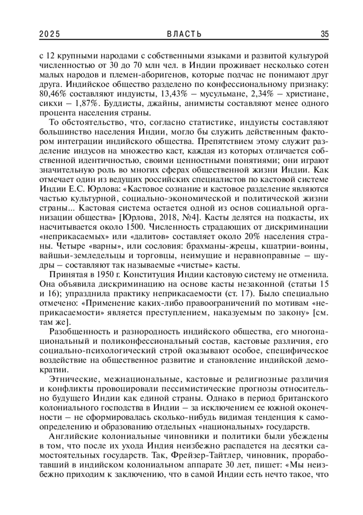 31. Юрлова Е.С. Роль каст в современной Индии // “Азия и Африка сегодня”. № 4, 2018. EDN: YVNENY