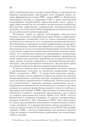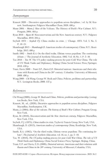 7. 	Тао 2018 - Тао В. Процесс разработки политики США в отношении Китая после окончания холодной войны. Роль аналитических центров и дипломатии США. Пекин: China Social Science Press/Springer, 2018. 438 с.