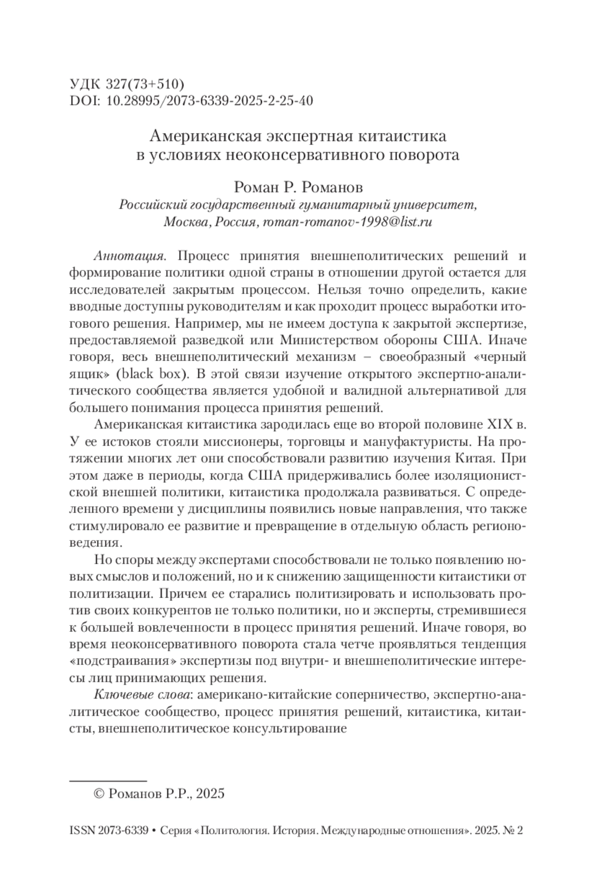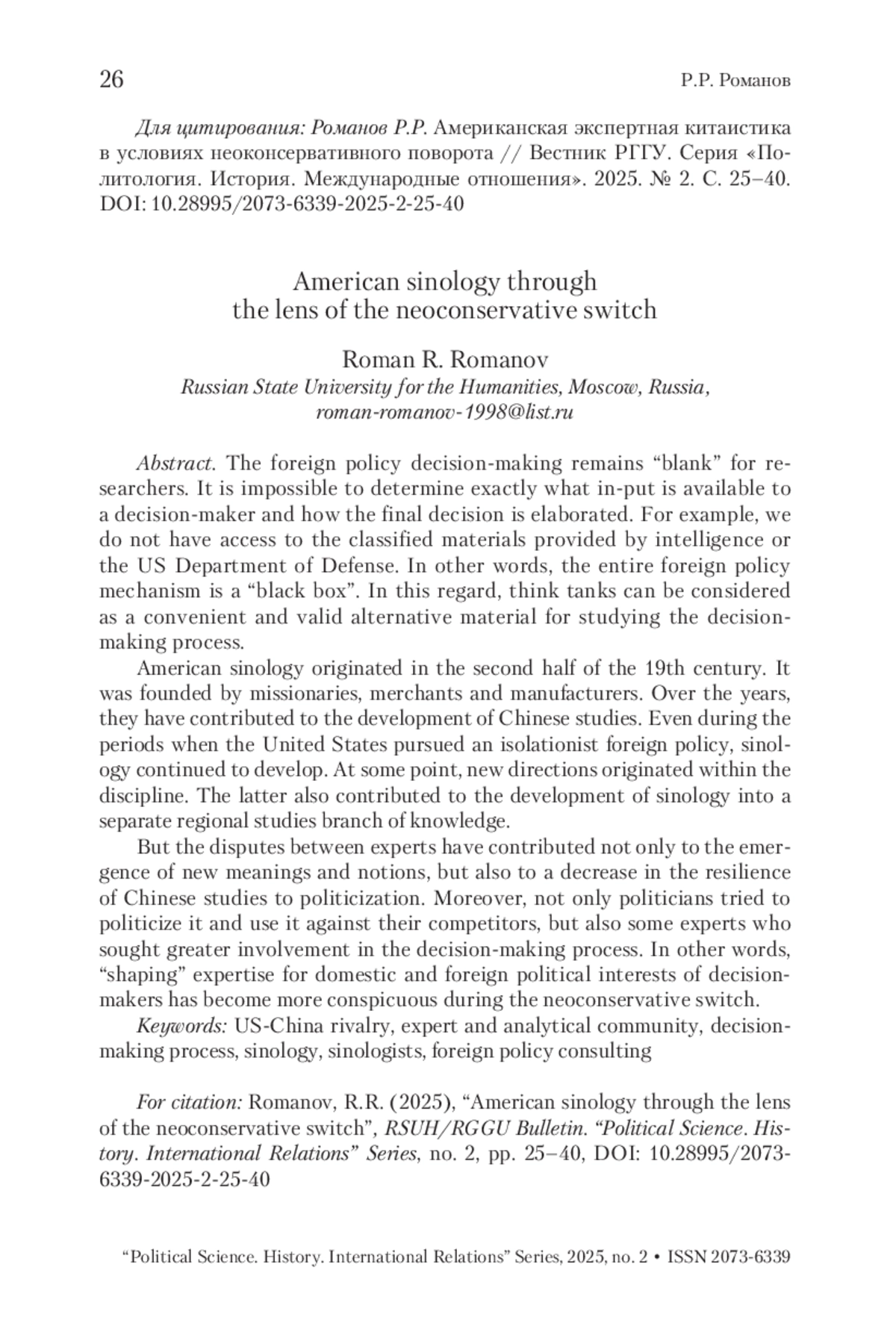 Процесс принятия внешнеполитических решений и проведения политики одной страны в отношении другой остается за соблюдением закрытого процесса. Невозможно точно определить, какие вводные данные доступны руководителям и как проходит процесс выработки итогового решения. Например, мы не имеем доступа к закрытой экспертизе, предоставлению разведки или Министерству защиты США. Иначе говоря, весь внешнеполитический механизм - своеобразный «черный ящик» (черный ящик). Эта связь, изучение открытого экспертно-аналитического сообщества, является удобной и достоверной для лучшего понимания процесса принятия решений. У ее истоков стояли миссионеры, торговцы и мануфактуристы. На протяжении многих лет они способствовали развитию Китая. При этом даже в периоды, когда США придерживались более изоляционистской внешней политики, китайская политика сохраняла силу. Но споры между экспертами способствовали не только появлению новых смыслов и положений, но и снижению защищенности китайской политики от политизации. Внутри ее старались политизировать и использовать против своих конкурентов не только политики, но и эксперты, стремившиеся к большей прозрачности в процессе принятия решений. Другими словами, во время неоконсервативного поворота стала четче проводиться тенденция «подстраивания» исследований в рамках внутри- и внешнеполитических интересов лиц, принимающих решения.