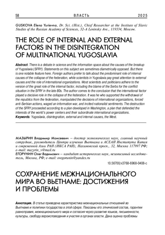 В науке и информационном пространстве идёт дискуссия о причинах распада Югославии (СФРЮ). Большинство учёных и политиков разных стран придерживаются версии о большой роли внутренннего фактора, в том числе о вине сербов за возникновение конфликтной ситуации в СФРЮ в конце 80-х годов. Автор статьи приходит к выводу, что международный фактор играл определяющую роль в развале федерации. Именно он поддерживал выход республик из состава федерации, вёл информационную войну, подтасовывал решения международных организаций, принуждал к антисербским действиям, разжигал националистические настроения.