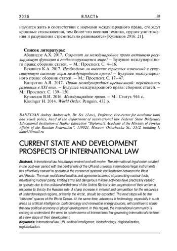 Международное право всегда развивалось и будет развиваться. Созданный в послевоенный период международный правопорядок с центральной ролью ООН и универсальными международно-правовыми инструментами фактически приостановил свое действие в условиях системной конфронтации между Западом и Россией. Основные многосторонние договоры и соглашения, направленные на предотвращение ядерных испытаний, поддержание ядерного паритета, ограничение вооружений и опасной военной деятельности, практически прекратили свое действие вследствие выхода из них в одностороннем порядке США или приостановки действия в ответ на это с российской стороны. Следует ожидать резкого возрастания интереса и соперничества за ресурсы малоосвоенных регионов, в первую очередь Арктики. Следующими шагами станут «зашельфовые» пространства Мирового океана. Вместе с тем достижения в области технологий, особенно в таких областях, как искусственный интеллект, биотехнологии и возобновляемые источники энергии, будут продолжать формировать новую политэкономию глобального развития. В связи с этим в международном сообществе приходит понимание необходимости создания норм международного права, регулирующих международные отношения на новом этапе их развития.