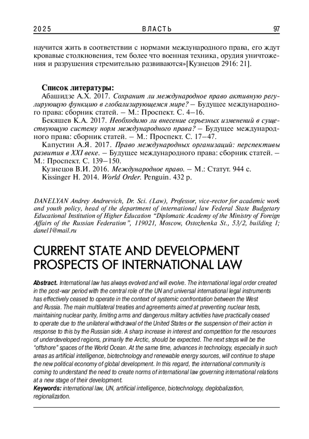 1. 	Абашидзе А.Х. 2017. Сохранит ли международное право активную регулирующую функцию в глобализирующемся мире? - Будущее международного права: сборник статей. - М.: Проспект. С. 4-16.