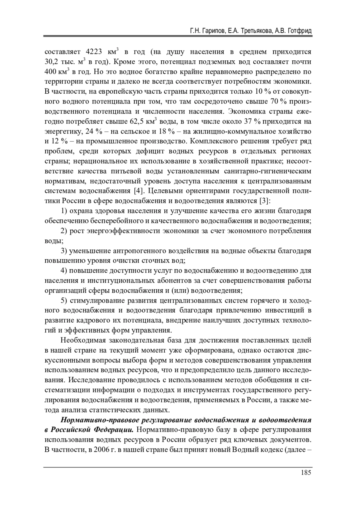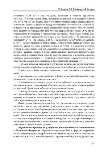 Введение. Водные ресурсы играют большую роль в экономике страны и жизни людей. Водный потенциал России является вторым в мире после Бразилии по своему размеру. Среднее многолетнее значение объема речного стокасоставляет 4223 км3 в год (на душу населения в среднем приходится 30,2 тыс. м3 в год). Кроме этого, потенциал подземных вод составляет почти 400 км3 в год. Но это водное богатство крайне неравномерно распределено по территории страны и далеко не всегда соответствует потребностям экономики. В частности, на европейскую часть страны приходится только 10 % от совокупного водного потенциала при том, что там сосредоточено свыше 70 % производственного потенциала и численности населения. Экономика страны ежегодно потребляет свыше 62,5 км3 воды, в том числе около 37 % приходится на энергетику, 24 % – на сельское и 18 % – на жилищно-коммунальное хозяйство и 12 % – на промышленное производство. Комплексного решения требует ряд проблем, среди которых дефицит водных ресурсов в отдельных регионах страны; нерациональное их использование в хозяйственной практике; несоответствие качества питьевой воды установленным санитарно-гигиеническим нормативам, недостаточный уровень доступа населения к централизованным системам водоснабжения [4]. Целевыми ориентирами государственной политики России в сфере водоснабжения и водоотведения являются
