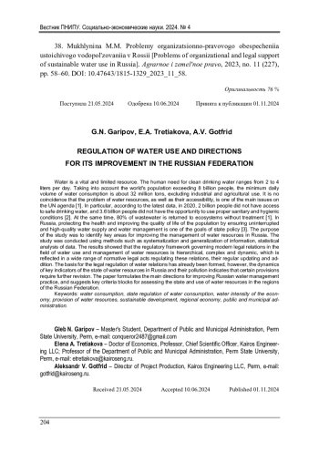 38. Мухлынина, М.М. Проблемы организационно-правового обеспечения устойчивого водопользования в России / М.М. Мухлынина // Аграрное и земельное право. - 2023. - № 11(227). - С. 58-60. DOI: 10.47643/1815-1329_2023_11_58 EDN: KEKJPA