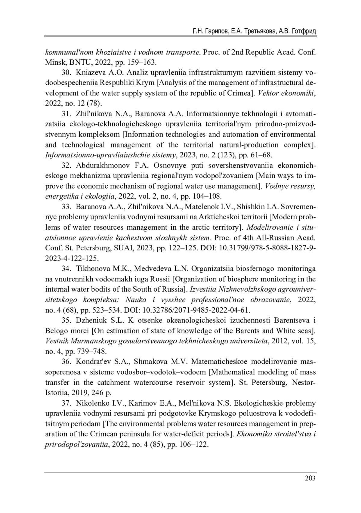 37. Николенко, И.В. Экологические проблемы управления водными ресурсами при подготовке Крымского полуострова к вододефицитным периодам / И.В. Николенко, Э.А. Каримов, Н.С. Мельникова // Экономика строительства и природопользования. - 2022. - № 4(85). - С. 106-122.