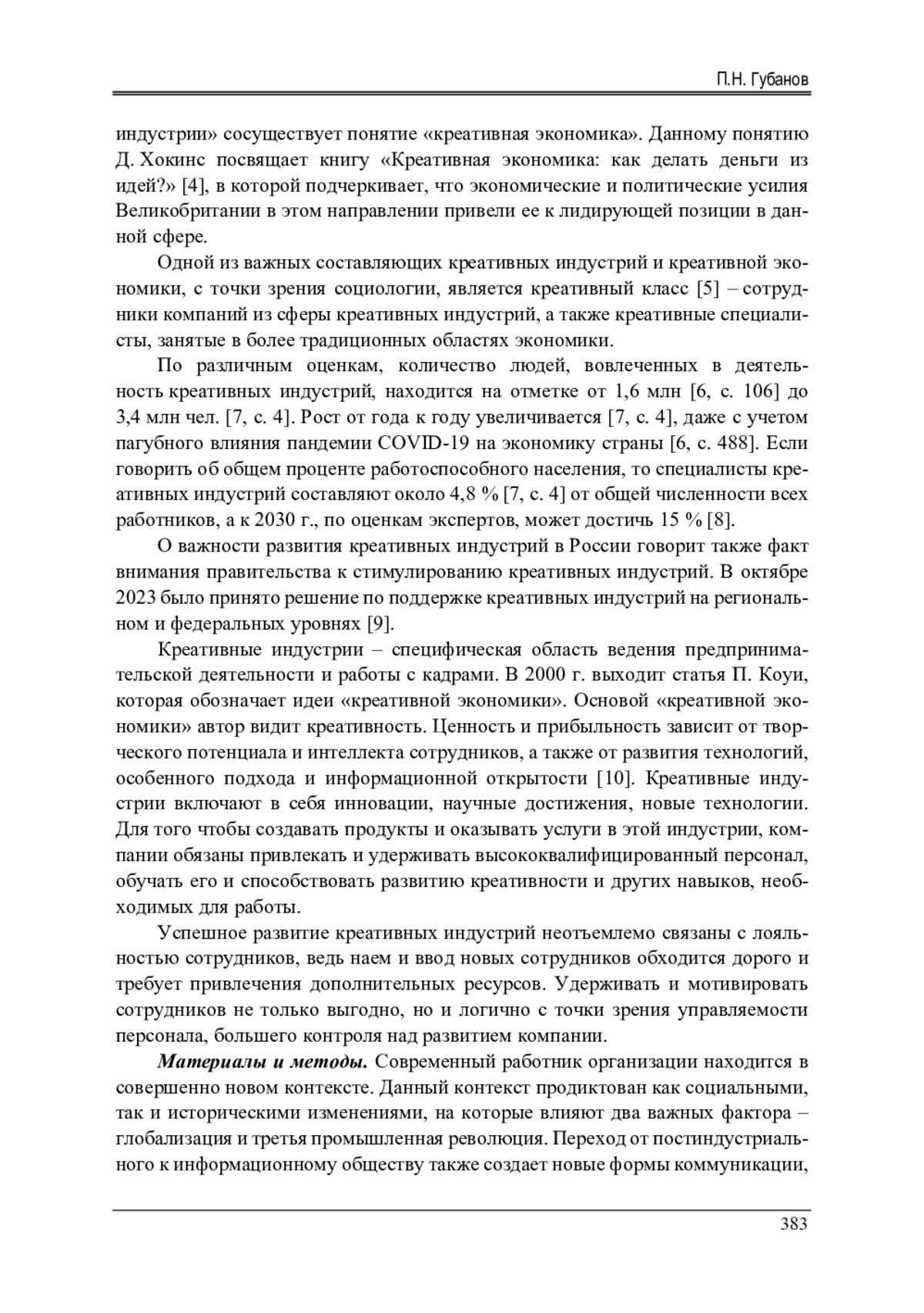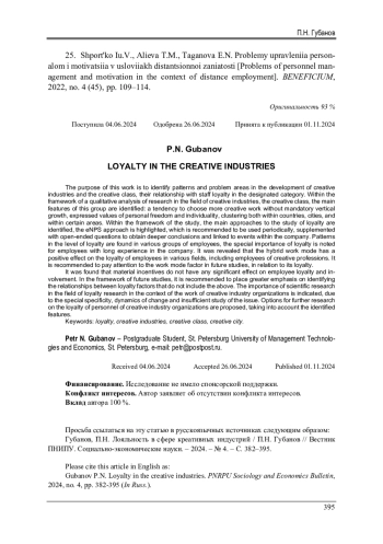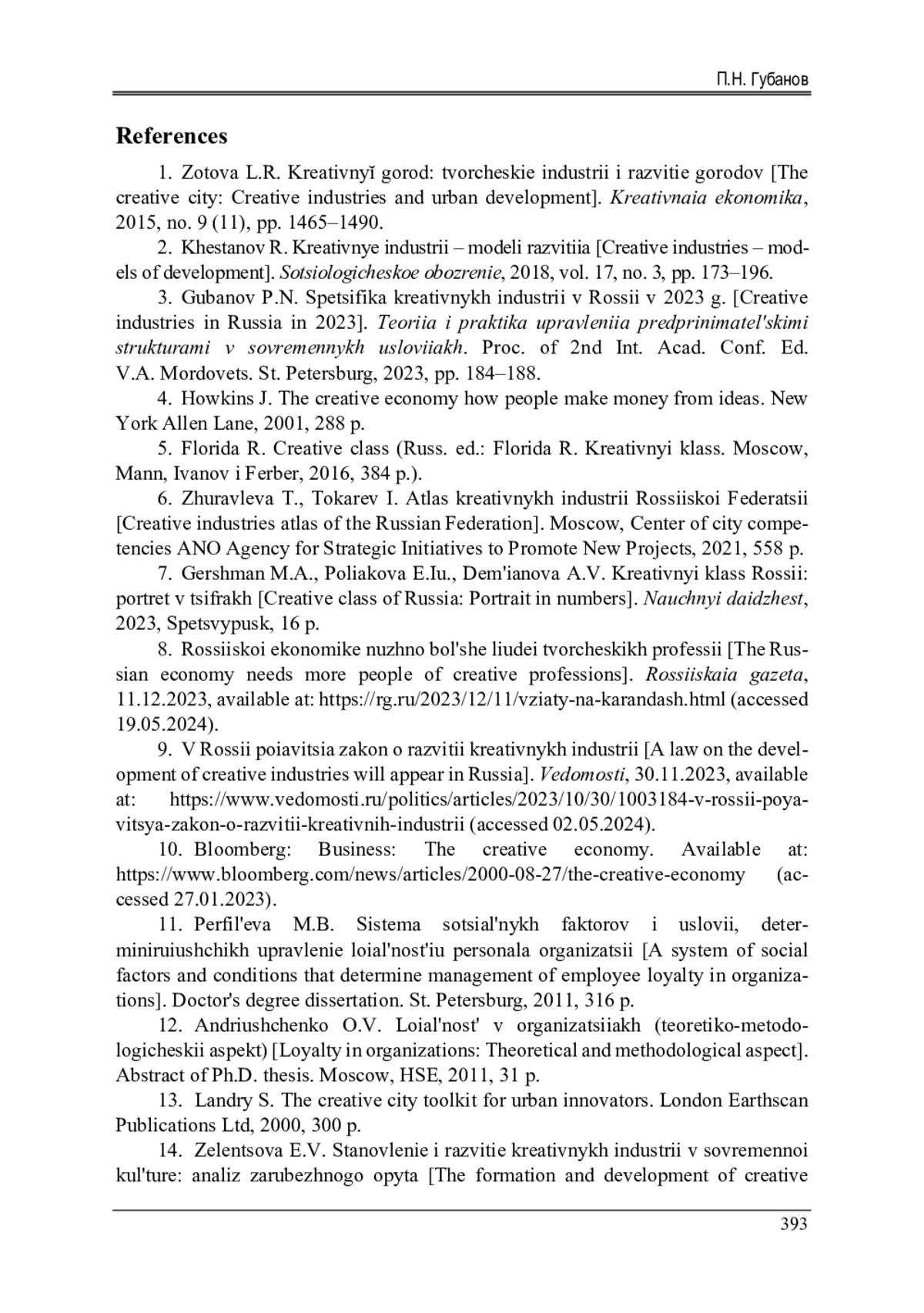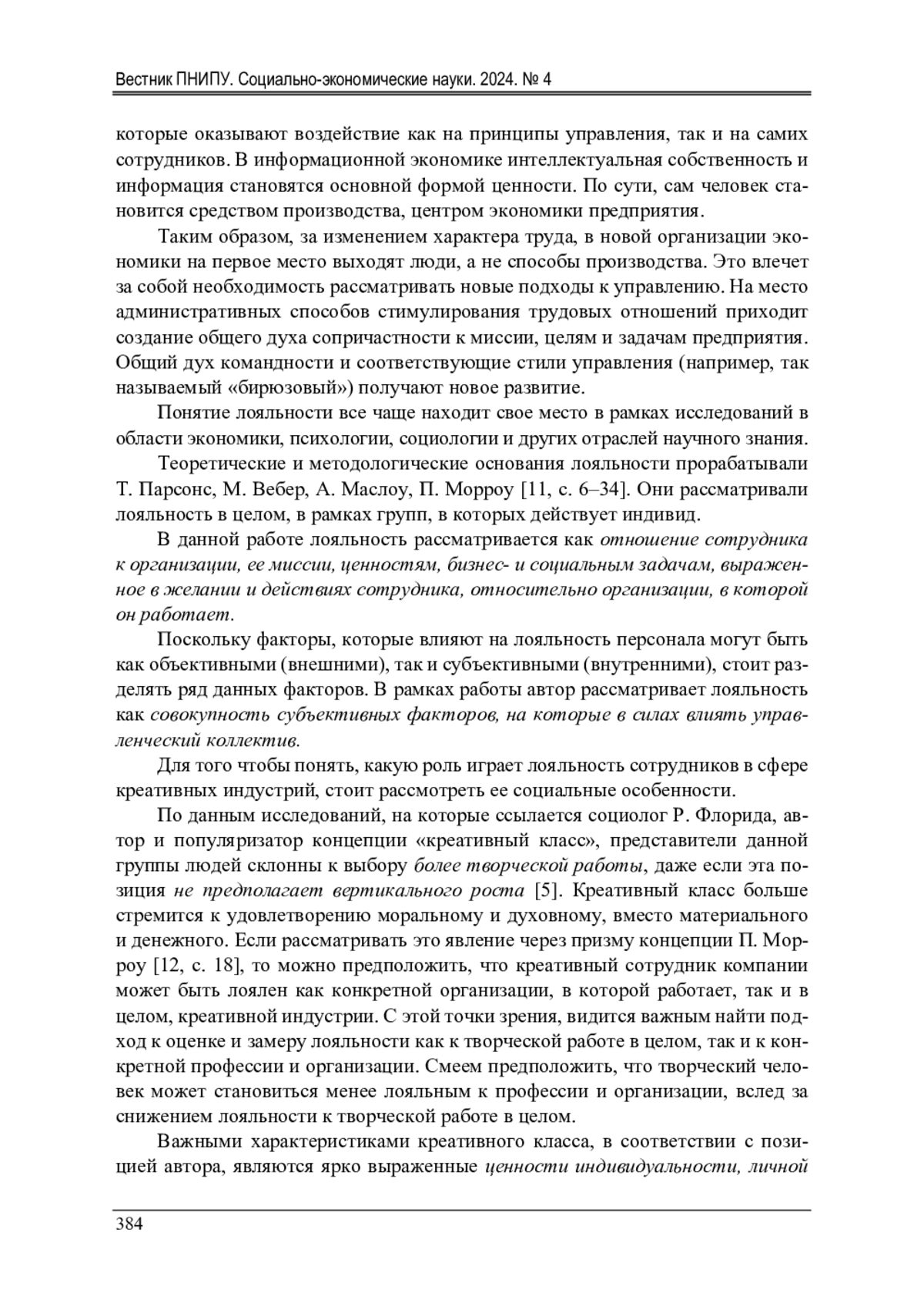 ГУБАНОВ П. Н. ЛОЯЛЬНОСТЬ В СФЕРЕ КРЕАТИВНЫХ ИНДУСТРИЙ // ВЕСТНИК ПЕРМСКОГО НАЦИОНАЛЬНОГО ИССЛЕДОВАТЕЛЬСКОГО ПОЛИТЕХНИЧЕСКОГО УНИВЕРСИТЕТА. СОЦИАЛЬНО-ЭКОНОМИЧЕСКИЕ НАУКИ. 2024. № 4