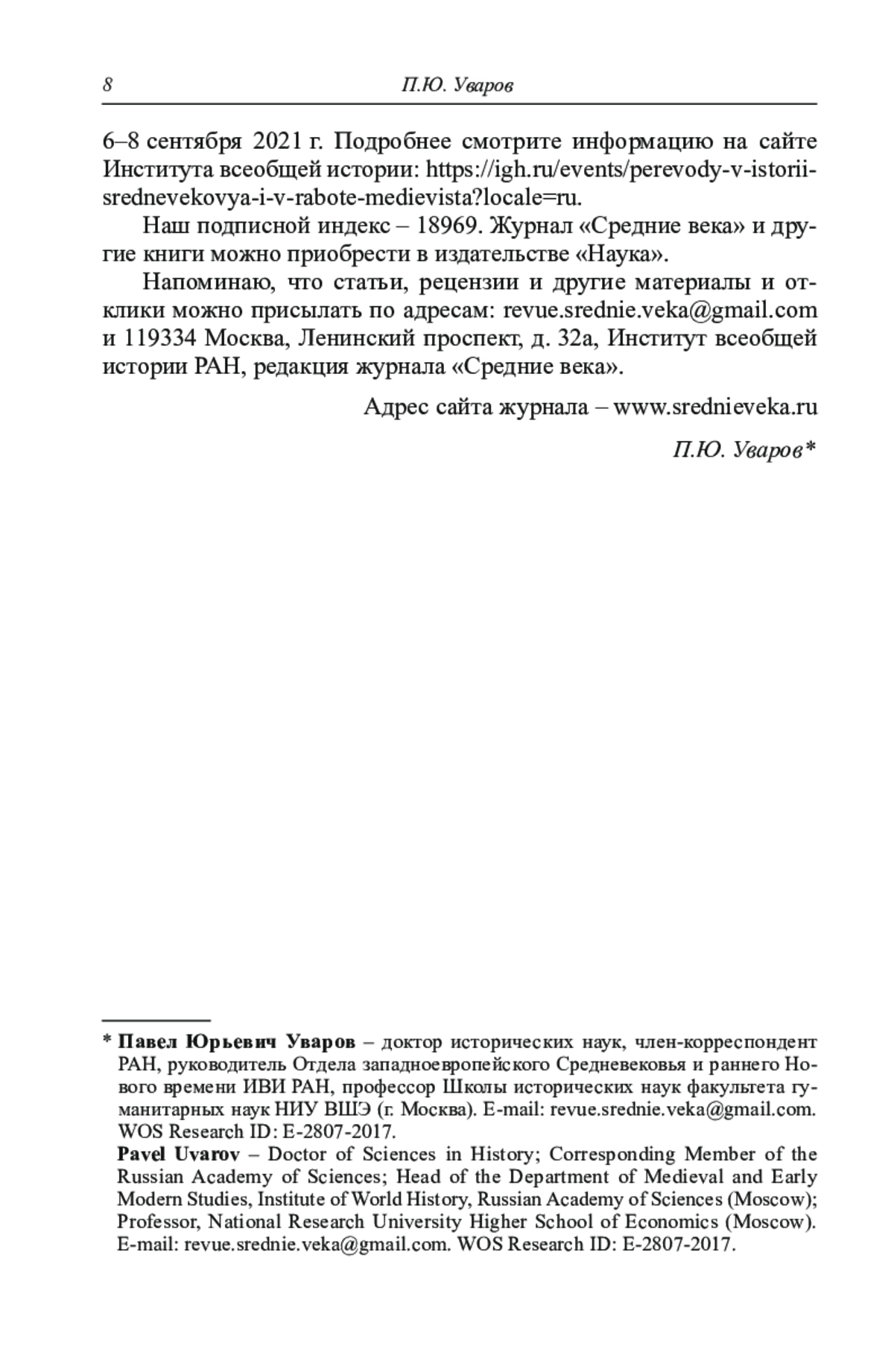 25 января 2021 г. от осложнений коронавируса скончался доктор исторических наук, ведущий научный сотрудник Санкт-Петербургского института истории РАН Борис Соломонович Каганович – потеря для отечественной исторической науки во многом невосполнимая. В Санкт-Петербургском институте истории, вблизи архивов, где он черпал важнейший для себя материал, Борис Соломонович нашел то пристанище, которое позволило ему развернуть наиболее полно свои научные замыслы, охватившие со временем и период Нового времени. Надо признать, что ни по первоначальной подготовке на кафедре классической филологии Московского государственного университета им. М. В. Ломоносова, которую он окончил в 1975 г., ни по настоящему предмету его зрелых исследований Борис Соломонович не мог подходить прямо под категорию исследователя-медиевиста. Однако его мысли и находки придавали новый смысл и порою новое направление работам коллег, исследовавших конкретные явления средневековой истории