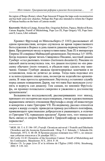 В статье рассматривается круг проблем, связанных с состоянием богослужения в Риме в XI в. Разбирается гипотеза «германизации» римского обряда, сформулированная М. Андриё и Т. Клаузером, и ее критика в современной историографии. Анализируются восприятие римского обряда за пределами Рима и папская политика по его продвижению. Особое внимание уделяется инициативам папы Григория VII в сфере богослужения и вопросу о появлении в Латеране каноников Сан-Фредиано и их литургического Ординария (Ordo officiorum ecclesiae Lateranensis). Автор предлагает новую датировку и определяет место составления Ординария из церкви св. Николая в Пассау, доказывая его связь с церквами Сан-Микеле, Сан-Джакомо и Сан-Мартино в римском районе Борго, где папа Иннокентий II провел масштабные строительные работы, вероятно, задумывая реформу ватиканского капитула по образцу капитула Латеранской базилики.