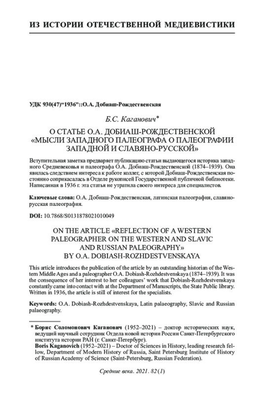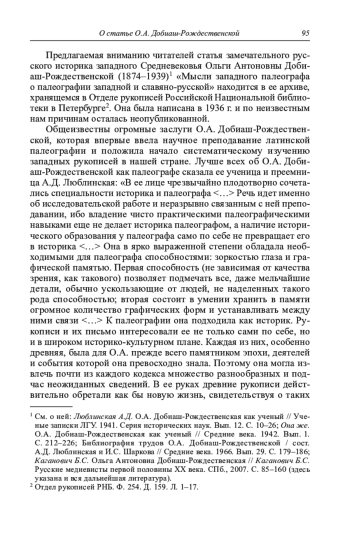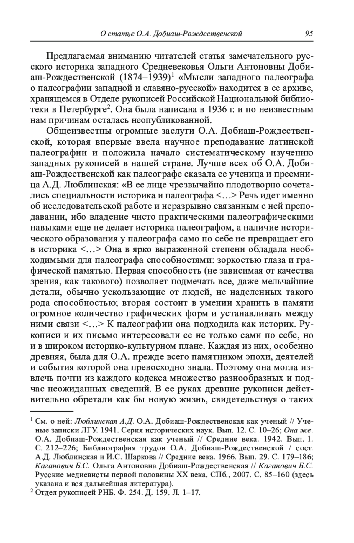 Предлагаемая вниманию читателей статья замечательного русского историка западного Средневековья Ольги Антоновны Добиаш-Рождественской (1874–1939) 1 «Мысли западного палеографа о палеографии западной и славяно-русской» находится в ее архиве, хранящемся в Отделе рукописей Российской Национальной библиотеки в Петербурге2. Она была написана в 1936 г. и по неизвестным нам причинам осталась неопубликованной.