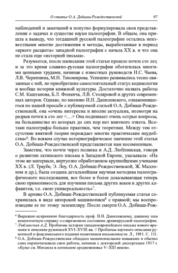 2. Добиаш-Рождественская О.А. История письма в средние века: Руководство к изучению латинской палеографии. Пб., 1923; 2-е изд., испр. и доп. М.; Л., 1936; 3-е изд., доп.; предисл. и комм. Л.И. Киселевой. М., 1987.