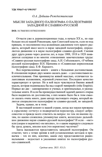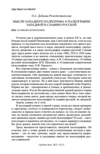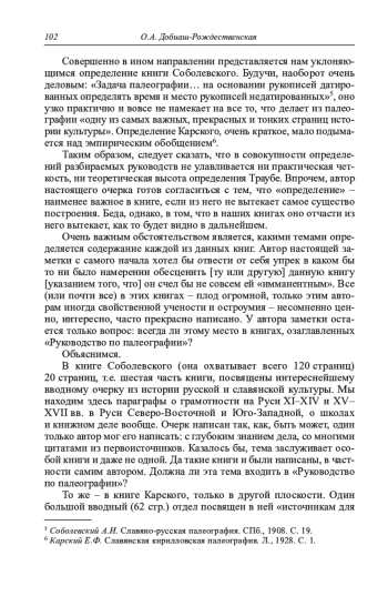 Отчасти уже в дореволюционные годы, в начале ХХ в., но еще больше после нашей Революции, при Советской власти, если не под прямым, то несомненно под косвенным давлением того яркого расцвета, который имел место в науке западной палеографии, определяется движение и в науке палеографии славяно-русской. Сменяя друг друга ровно через десяток лет, в годы 1908, 1918 и 1928 появляются солидные и во многих отношениях замечательные труды: «Славяно-русская палеография» акад. А. И. Соболевского, «Учебник русской палеографии» В. Н. Щепкина и «Славянская кирилловская палеография» акад. Е. Ф. Карского