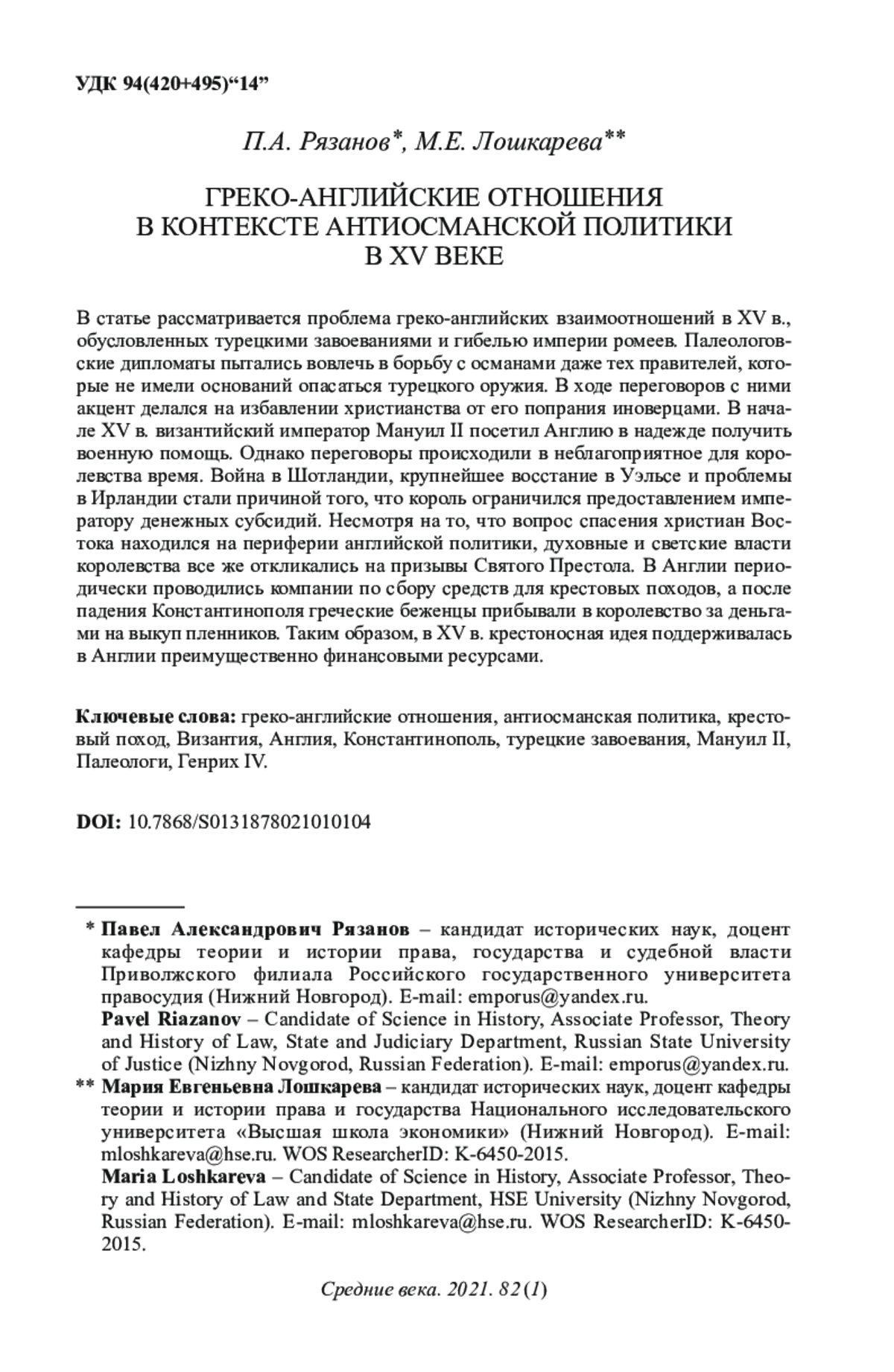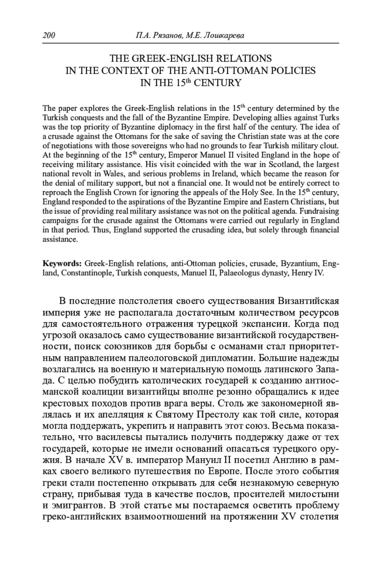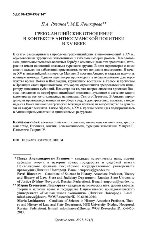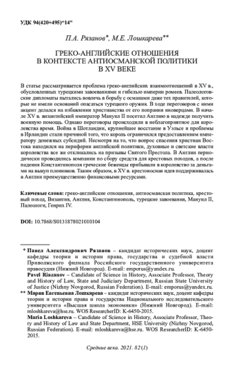 В статье рассматривается проблема греко-английских взаимоотношений в XV в., обусловленных турецкими завоеваниями и гибелью империи ромеев. Палеологовские дипломаты пытались вовлечь в борьбу с османами даже тех правителей, которые не имели оснований опасаться турецкого оружия. В ходе переговоров с ними акцент делался на избавлении христианства от его попрания иноверцами. В начале XV в. византийский император Мануил II посетил Англию в надежде получить военную помощь. Однако переговоры происходили в неблагоприятное для королевства время. Война в Шотландии, крупнейшее восстание в Уэльсе и проблемы в Ирландии стали причиной того, что король ограничился предоставлением императору денежных субсидий. Несмотря на то, что вопрос спасения христиан Востока находился на периферии английской политики, духовные и светские власти королевства все же откликались на призывы Святого Престола. В Англии периодически проводились компании по сбору средств для крестовых походов, а после падения Константинополя греческие беженцы прибывали в королевство за деньгами на выкуп пленников. Таким образом, в XV в. крестоносная идея поддерживалась в Англии преимущественно финансовыми ресурсами.