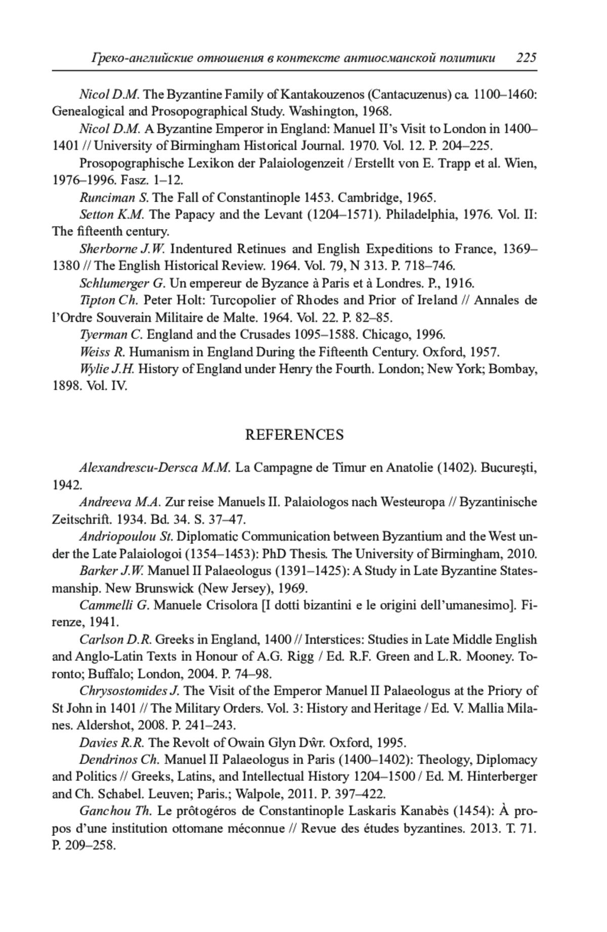 35. Nicol D.M. A Byzantine Emperor in England: Manuel II’s Visit to London in 1400-1401 // University of Birmingham Historical Journal. 1970. Vol. 12. P. 204-225.