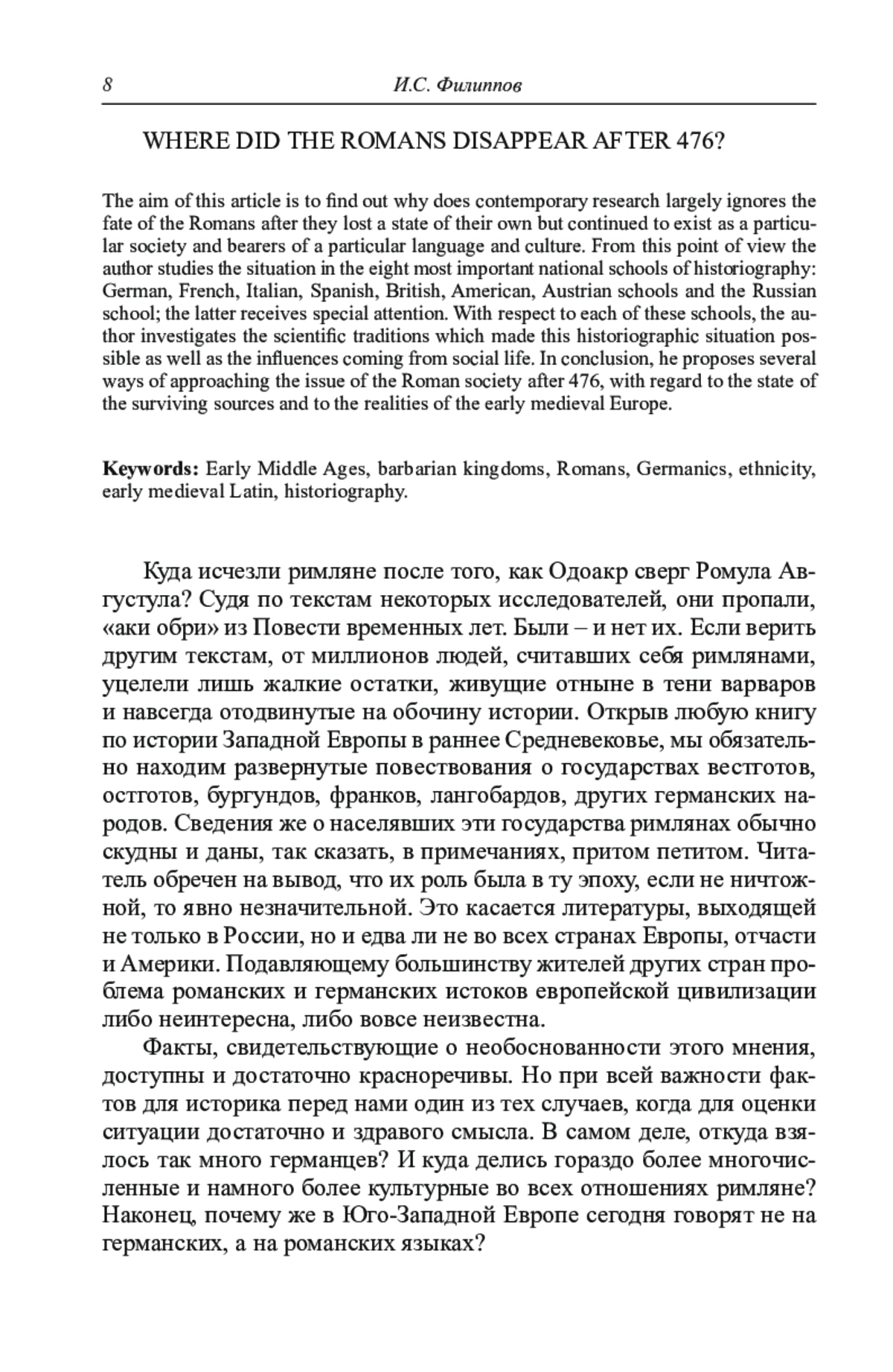 Статья посвящена вопросу о том, почему в современной историографии так мало говорится о судьбе римского общества и римлян как этноса и носителей определенного языка и определенной культуры после падения Западной Римской империи, когда римляне утратили свою государственность. Под этим углом зрения рассматривается ситуация в основных национальных школах медиевистики: немецкой, французской, итальянской, испанской, английской, американской, недавно оформившейся австрийской и в российской школе, которой уделено особое внимание. Применительно к каждой из них автор исследует научные традиции, обусловившие такое положение вещей, а также влияния на историографию, идущие из общественной жизни. В заключении к статье предлагаются возможные пути изучения римского общества после 476 г., с учетом состояния источников и реалий раннесредневековой истории.