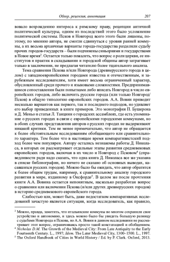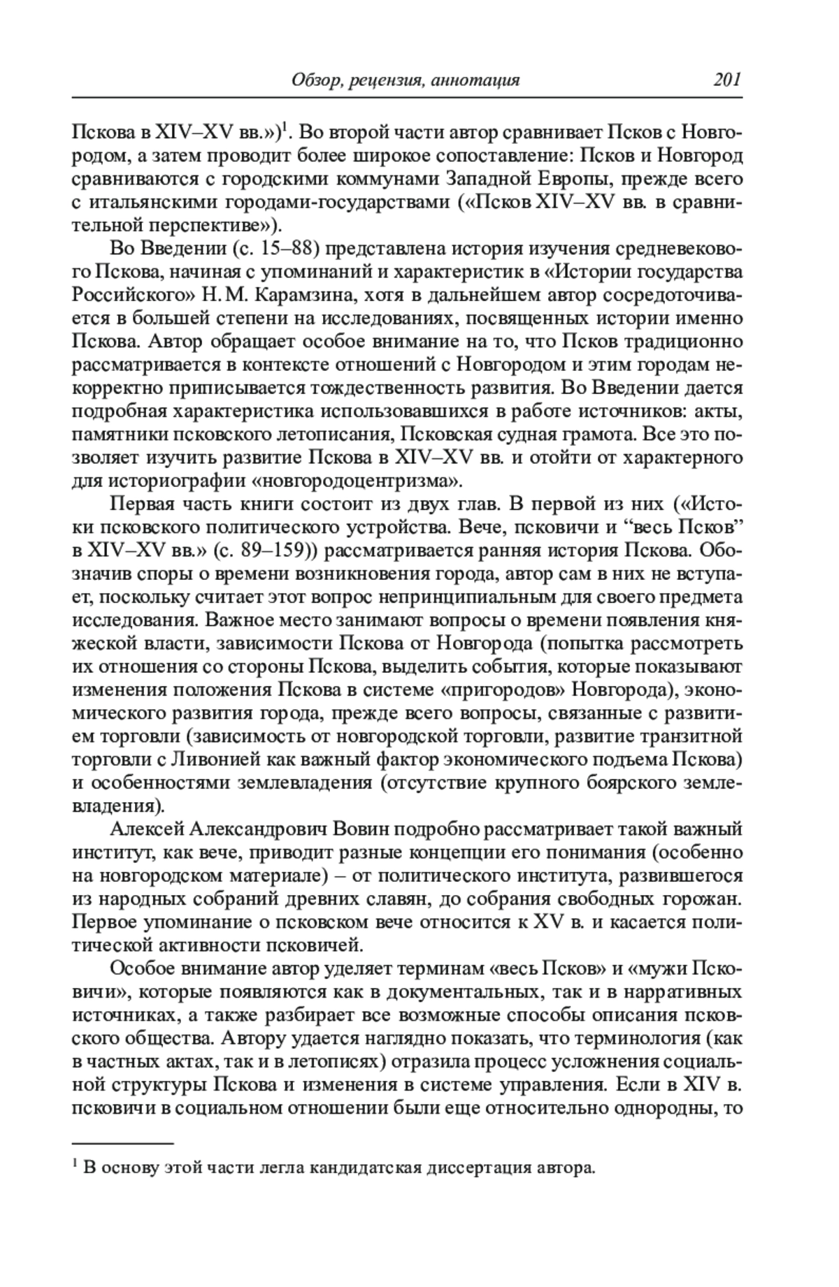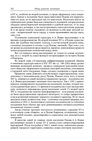 Во Введении (с. 15–88) представлена история изучения средневекового Пскова, начиная с упоминаний и характеристик в «Истории государства Российского» Н. М. Карамзина, хотя в дальнейшем автор сосредоточива - ется в большей степени на исследованиях, посвященных истории именно Пскова. Автор обращает особое внимание на то, что Псков традиционно рассматривается в контексте отношений с Новгородом и этим городам некорректно приписывается тождественность развития. Во Введении дается подробная характеристика использовавшихся в работе источников: акты, памятники псковского летописания, Псковская судная грамота. Все это позволяет изучить развитие Пскова в XIV–XV вв. и отойти от характерного для историографии «новгородоцентризма»