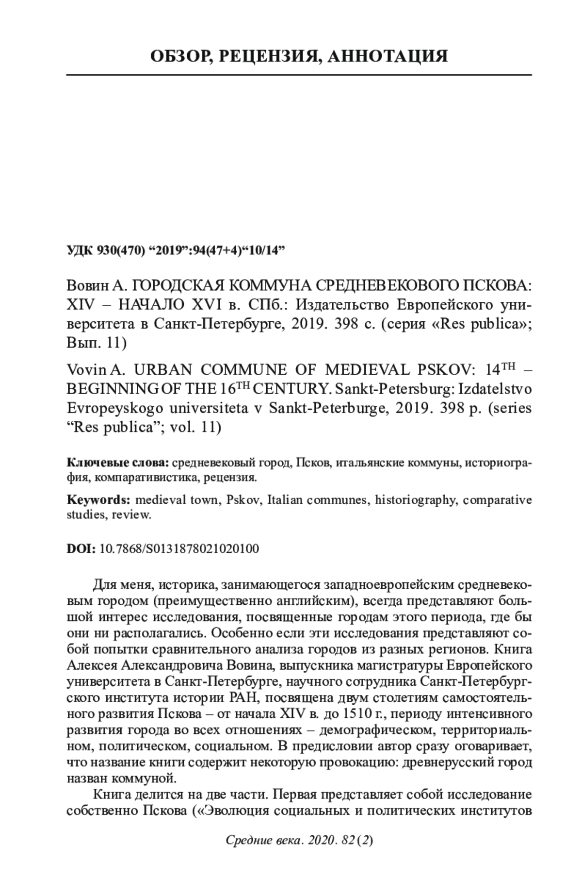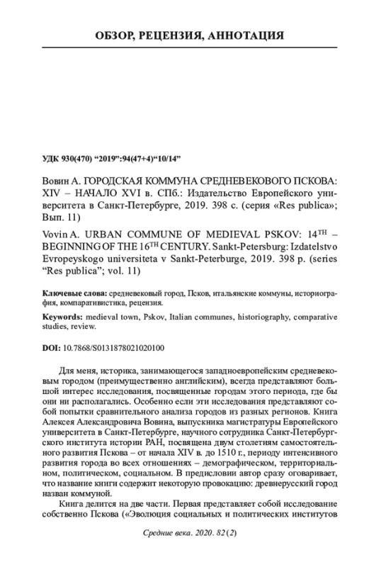 Для меня, историка, занимающегося западноевропейским средневековым городом (преимущественно английским), всегда представляют большой интерес исследования, посвященные городам этого периода, где бы они ни располагались. Особенно если эти исследования представляют собой попытки сравнительного анализа городов из разных регионов. Книга Алексея Александровича Вовина, выпускника магистратуры Европейского университета в Санкт-Петербурге, научного сотрудника Санкт-Петербургского института истории РАН, посвящена двум столетиям самостоятельного развития Пскова – от начала XIV в. до 1510 г., периоду интенсивного развития города во всех отношениях – демографическом, территориальном, политическом, социальном. В предисловии автор сразу оговаривает, что название книги содержит некоторую провокацию: древнерусский город назван коммуной