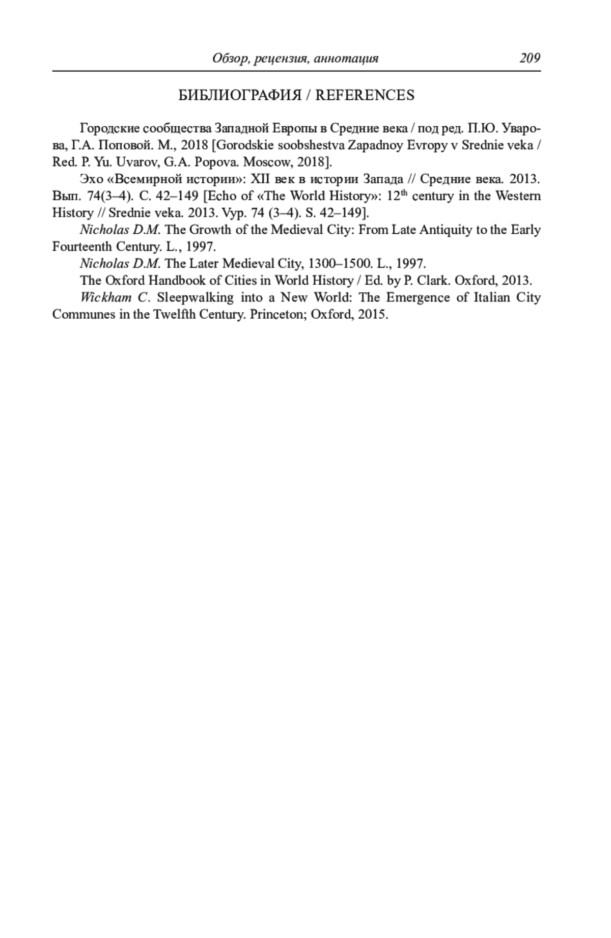 3. 	Nicholas D.M. The Growth of the Medieval City: From Late Antiquity to the Early Fourteenth Century. L., 1997.