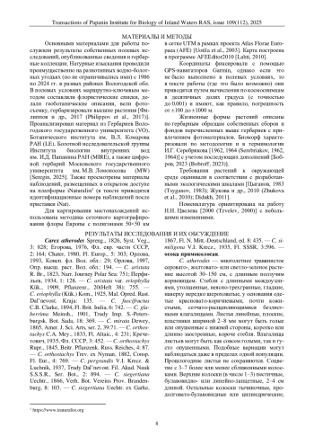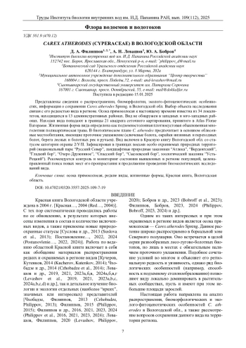 47. Филиппов Д.А., Левашов А.Н., Бобров Ю.А. Carex capitata (Cyperaceae) в Вологодской области // Труды Ин-та биологии внутренних вод им. И.Д. Папанина РАН. 2024. Вып. 106(109). С. 7-16. DOI: 10.47021/0320-3557-2024-7-16