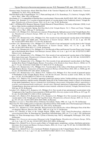20. Левашов А.Н., Романовский А.Ю., Филиппов Д.А. Находки редких и охраняемых сосудистых растений бассейна реки Сухона (верхний и средний участок) // Фиторазнообразие Восточной Европы. 2023б. Т. 17, № 4. С. 126-156. DOI: 10.24412/2072-8816-2023-17-4-126-156